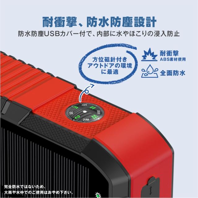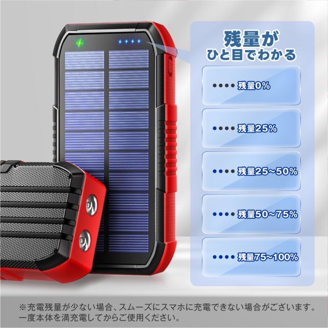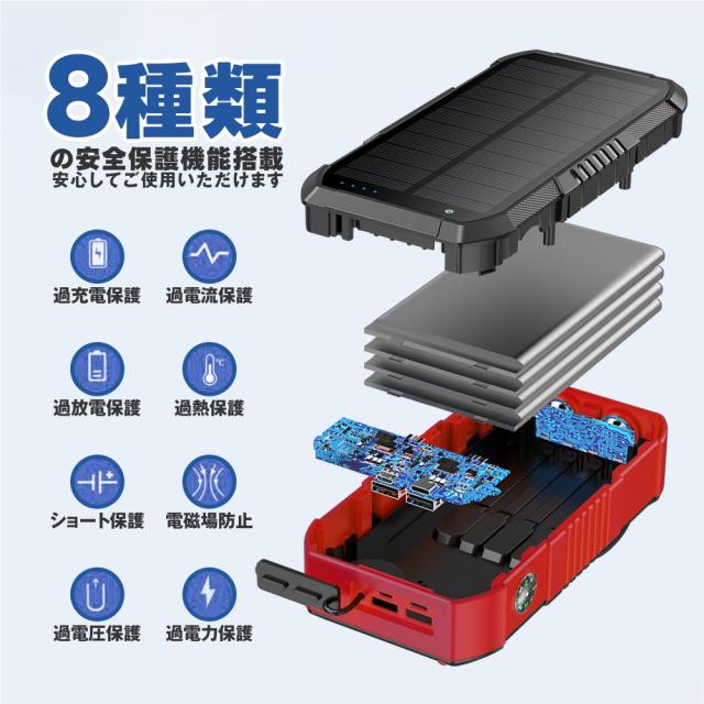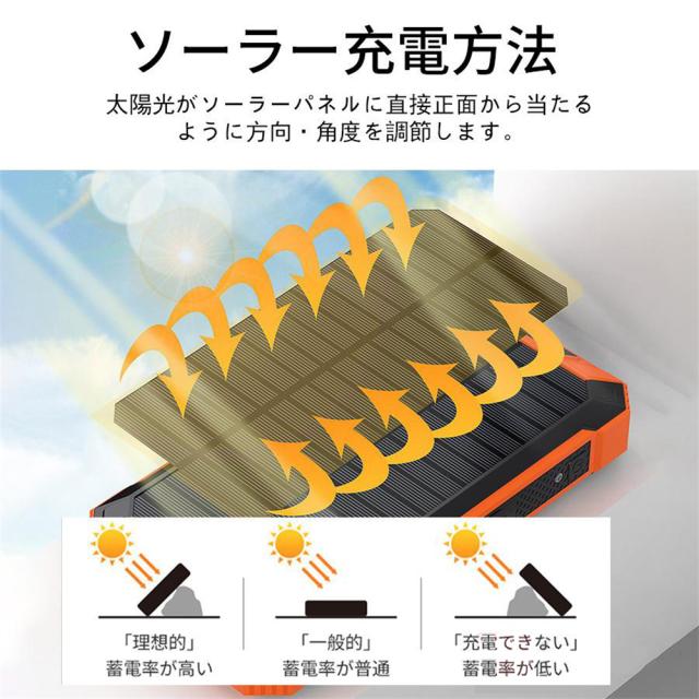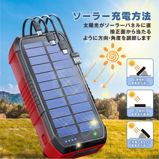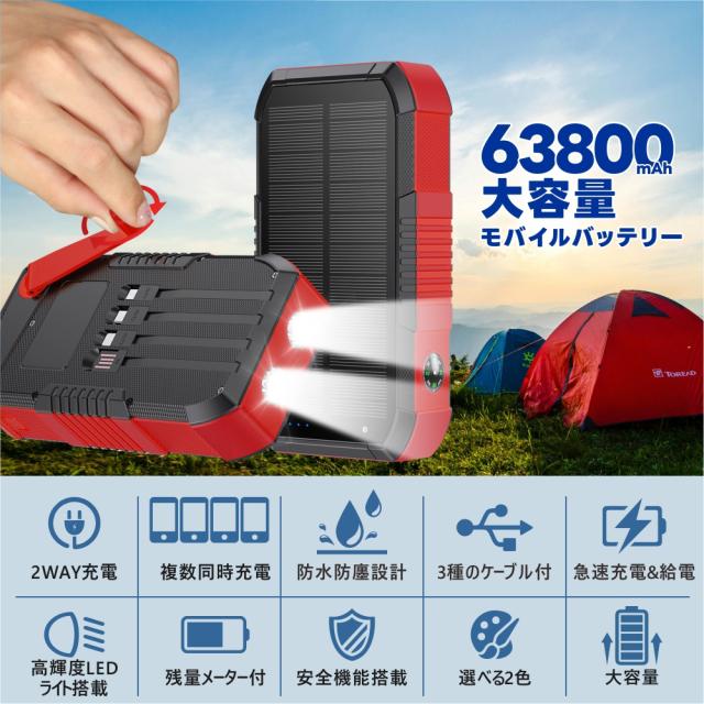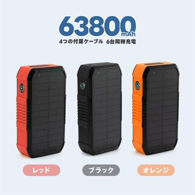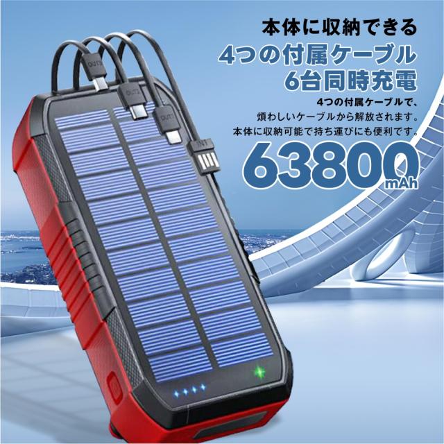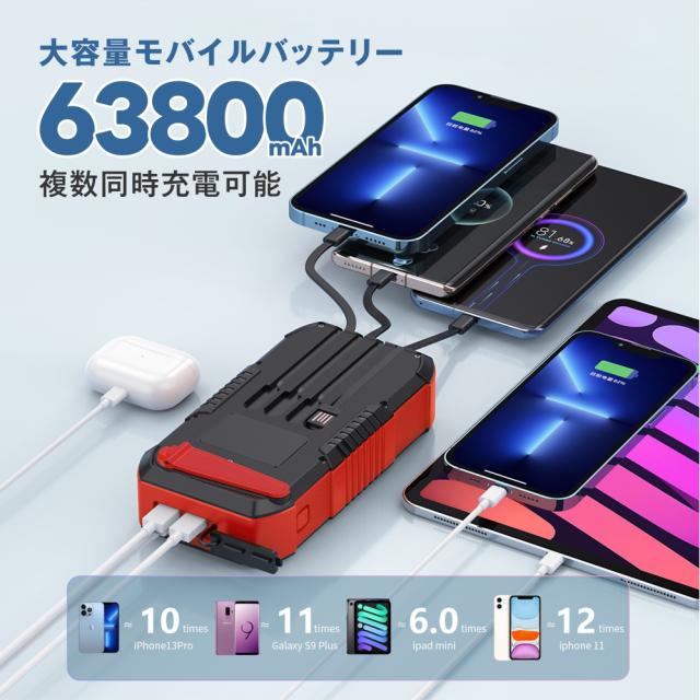 【手回し充電&22.5W最速 P10倍】ソーラーモバイルバッテリー 大容量 モバイルバッテリー 63800mAh 22.5W/PD18W 急速充電 ソーラーチャージャー 6台同時充電 3本ケーブル内蔵+USBポート 5way蓄電 IPX7防水 高輝度 LEDライト付き 停電対策 地震 災害 防災グッズ