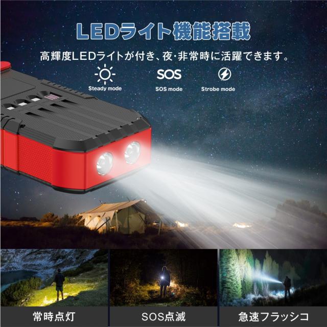 モバイルバッテリー 本体には暗所で役立つLED照明ライトが2つ備わり、夜道や停電時で懐中電灯代わりに暗闇を照らしてくれるほか、地震や台風など非常時の救難信号として役立ちます。