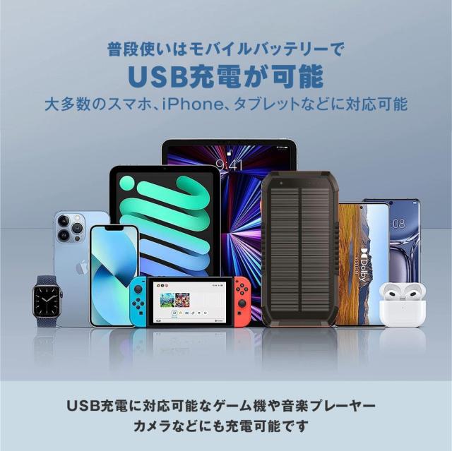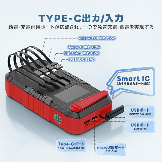 出力にはType-C/microUSB/アイフォン用の3規格出力ケーブルが内蔵され、さらに、2個USB出力ポート、及びType-C入出力ポートに加え、最大6台同時充電が可能です。専用ケーブルを持ち歩く必要がなく、多様なデバイスにも対応出来ます。スマホやタブレット、カメラ、携帯扇風機、ゲーム機などUSB充電を使った各機種に幅広く複数回充電可能な超大容量モバイルバッテリーです。ケーブルを忘れたときも充電ができないなんて心配はいりません。