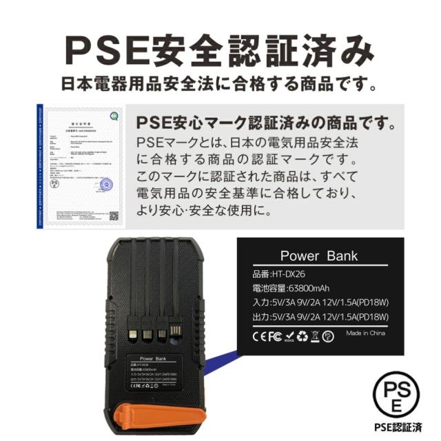 63800mAhの超大容量により、1回フル充電すればスマホとタブレットなどに数回に充電でき、充電切れの心配がありません。iPhone 11を約10回、iPad miniを約8回、Galaxy S10を約8回以上、iPad Airを約4.5回の充電が可能です。出張や旅行などの短期外出だけでなく、台風、地震など緊急災害時に非常用電源としても使えます。