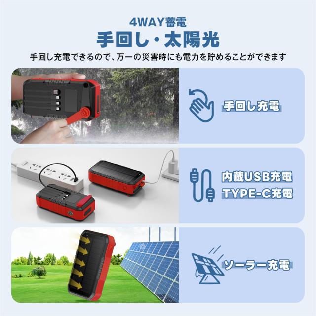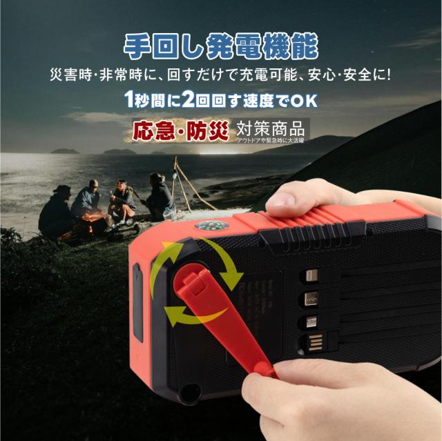 モバイルバッテリー 内蔵のスマホ充電器で蓄電できる上に、ソーラーパネルが搭載されて、太陽光を当てることで蓄電可能です。さらに日差しがない緊急事態の場合、手回し発電も可能で、ハンドルを回して発電し、アウトドアなど電源がない場所に重宝します。