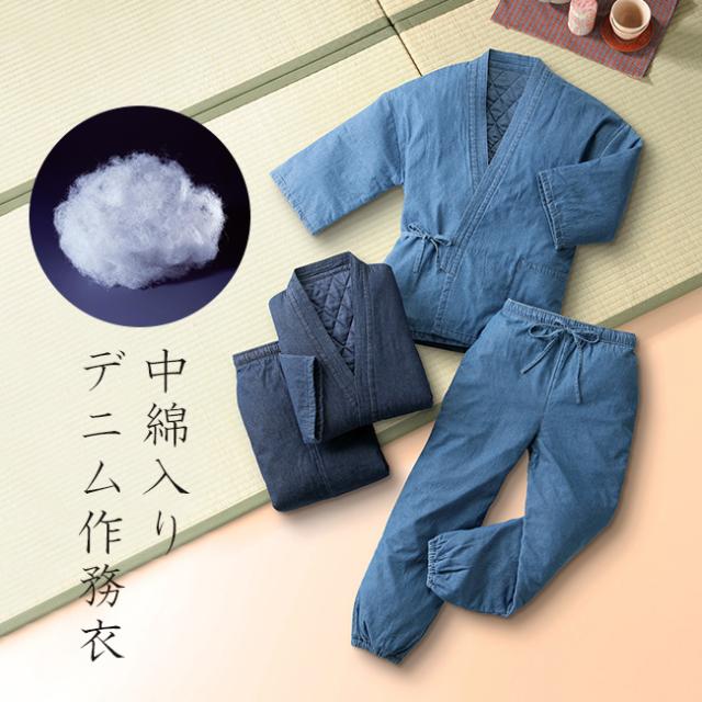 カジュアルなデニム生地に中綿を入れた、寒い季節にぴったりな作務衣です。