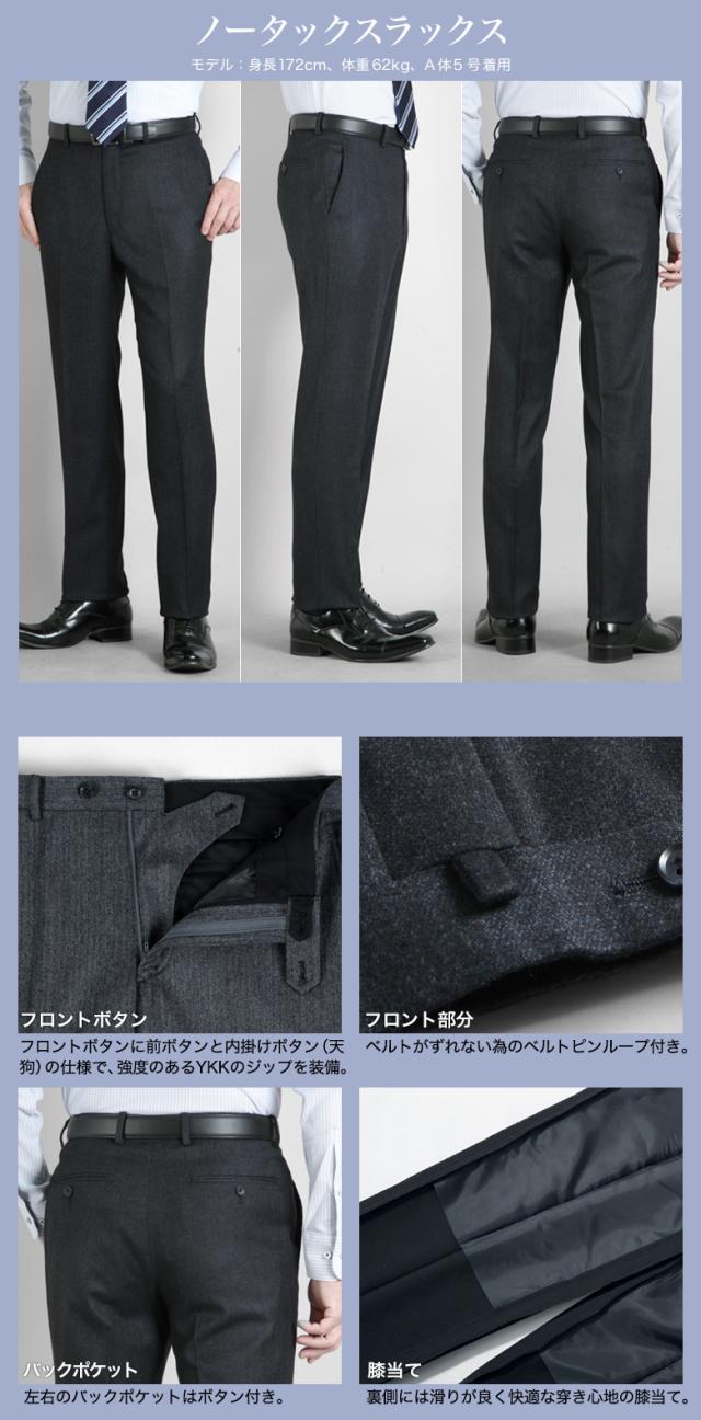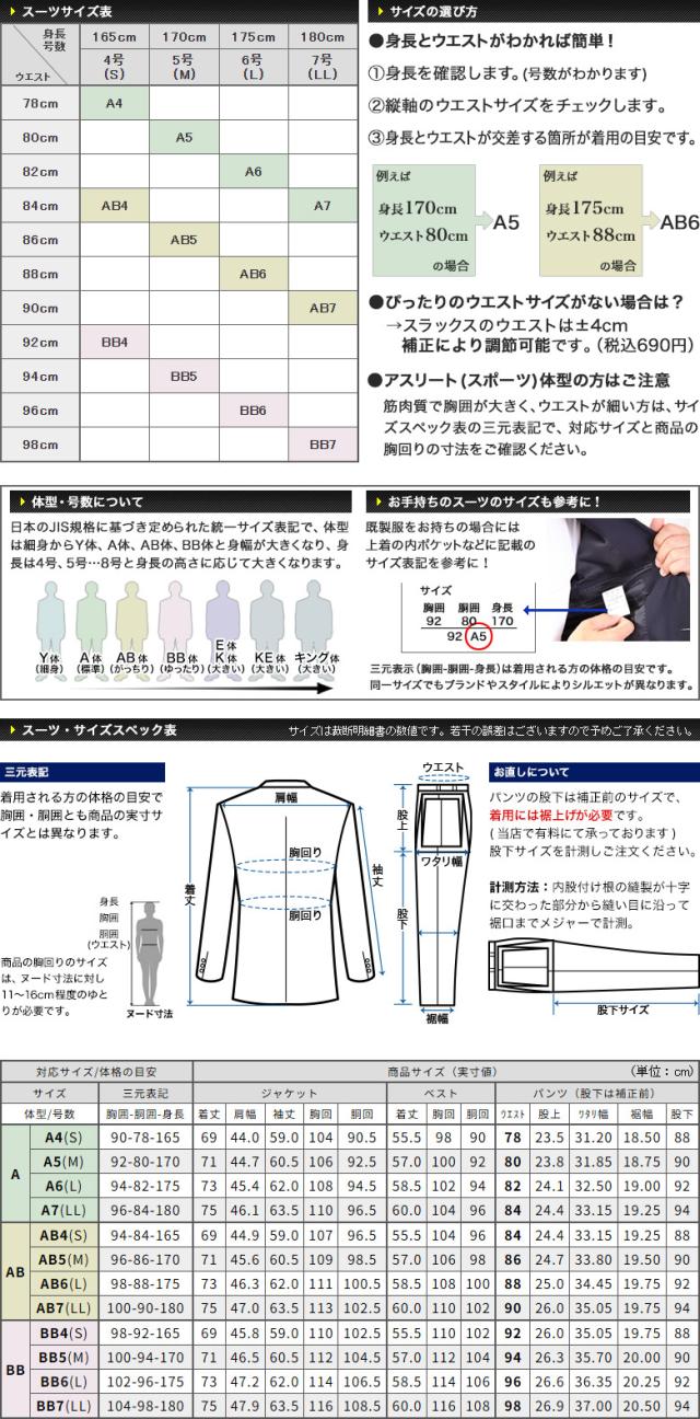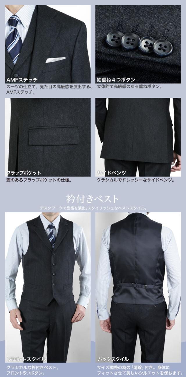| ▼ジャケット ・2ツボタン ・ナローラペル ・AMFステッチ ・総裏仕立て ・袖重ね4ツボタン ・サイドベンツ ・両脇フラップポケット ▼ベスト(ジレ) ・5ツボタン(襟付き) ・ウエスト調節可能な尾錠付き ▼スラックス ・ノータック ・膝裏付 ・バックポケット(左右ともボタン付き) ・ベルトピンループ |