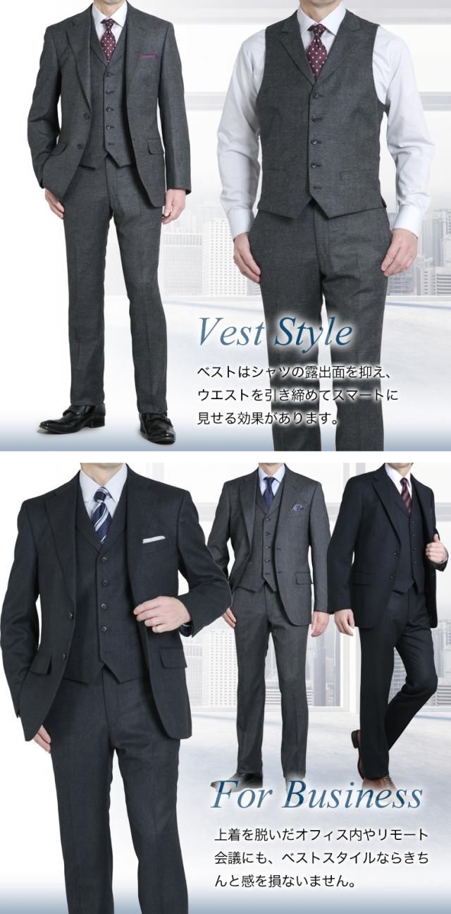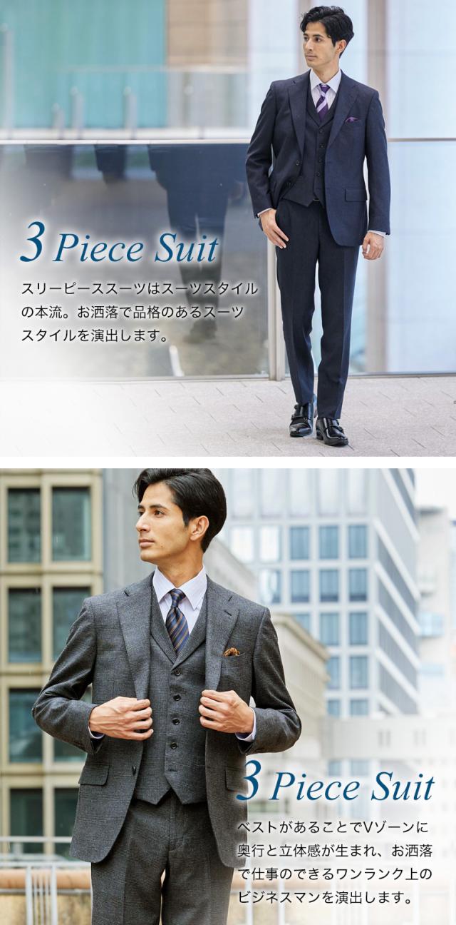 | 【カシミヤブレンド・スリーピーススーツ】 やや厚みと暖かみのあるカシミヤ混紡ウールを仕様したスリーピーススーツ。スリーピースはブリティッシュスタイルの伝統とも言える正統派スーツスタイル。ベストがあることでVゾーンに奥行き、立体感が生まれ、お洒落で仕事のできるワンランク上のビジネスマンを演出します。ジレベストは上着を脱いだオフィスでもきっちり感を損なわず、リモート会議や在宅でのテレワークにも活用でき、通勤時など朝夕の気温の変化にも対応いたします。ジャケットは背抜き仕立てで秋冬春のロングシーズンに活躍。素材は高級ウールカシミヤをブレンドした生地を使用。程よくスリムでスタイリッシュなフォルムは、ビジネスシーンだけでなく結婚式や披露宴、パーティなどセレモニーシーンにも幅広くご着用いただけます。 |