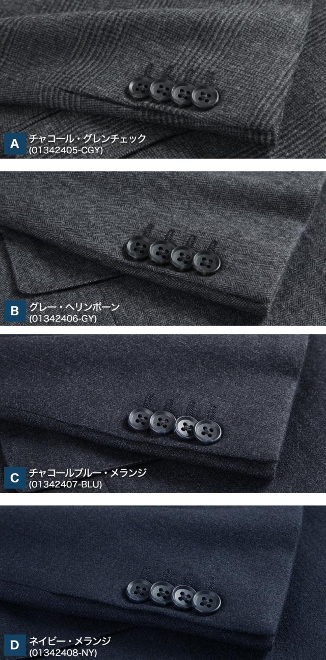 | 【A】チャコール・グレンチェック(01342405-CGY) 【B】グレー・ヘリンボーン(01342406-GY) 【C】チャコールブルー・メランジ(01342407-BLU) 【D】ネイビー・メランジ(01342408-NY) |