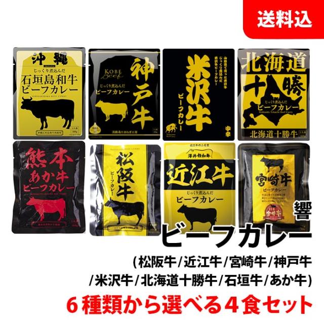 送料無料 メール便 ご当地 ビーフカレー 4食セット 8種類から選べる (松坂牛/近江牛/宮崎牛/神戸牛/米沢牛/あか牛/十勝牛/石垣牛) レトルトカレー (株) 響