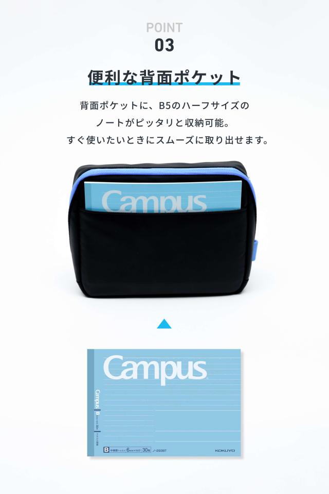 背面ポケットには、B5ハーフサイズのノートがピッタリ収まります。