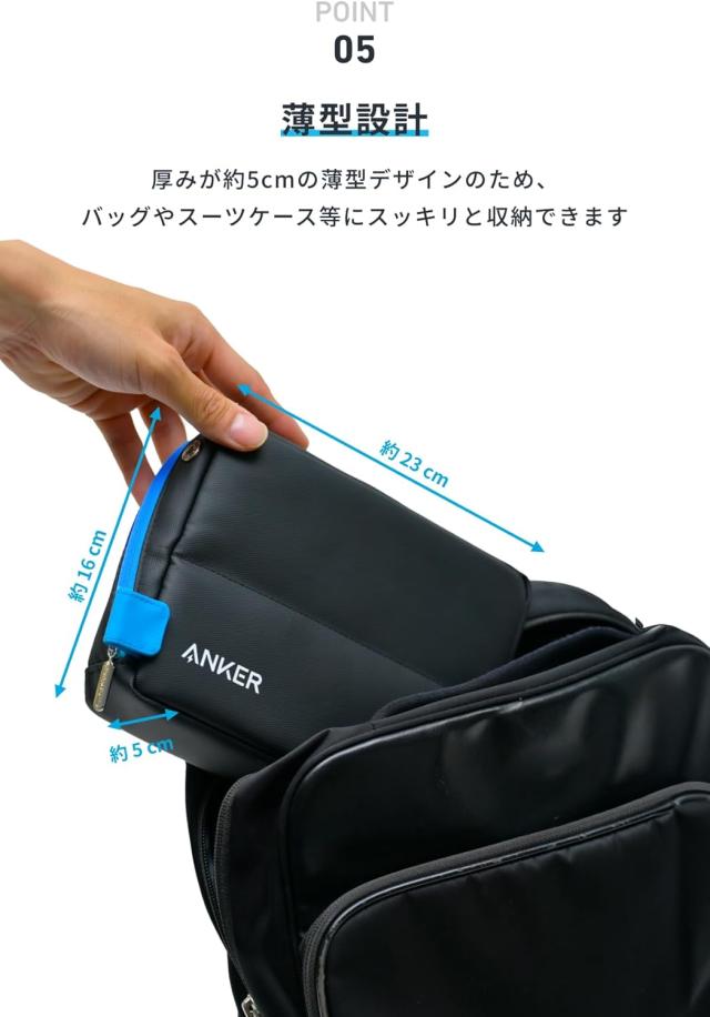 厚み約5cmの薄型設計で、リュックや仕事カバン、スーツケースにスッキリと収容いただけます。