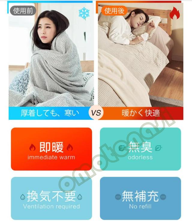 - 書いてあるほどの広さを温めるのは時間がかかる。でもちょっと手足を速暖するには便利商品です。