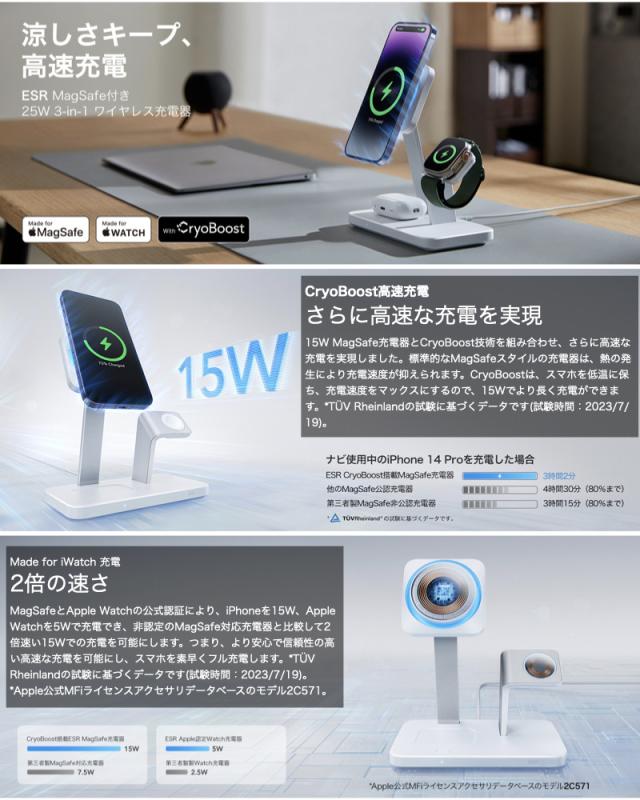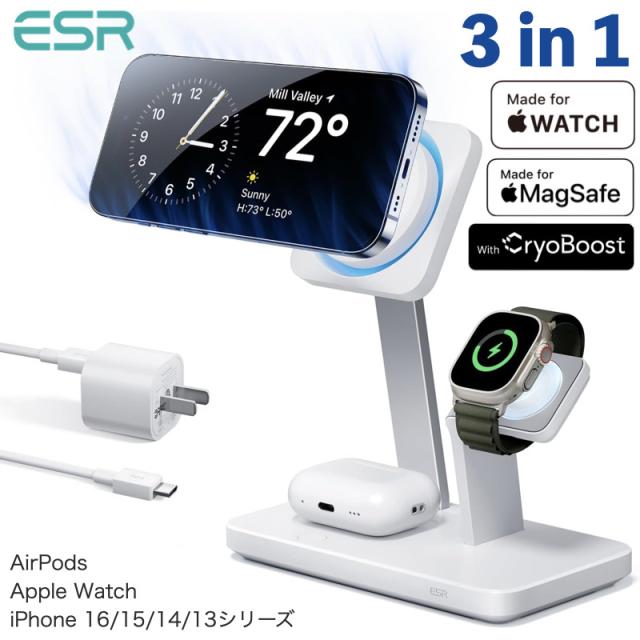 ESR 25W 3in1 MagSafe充電器 Apple認定 磁気ワイヤレス充電器 CryoBoost冷却ファン付き 充電スタンド iPhone 17/16/15/14/13/12/Apple Watch/AirPods 4/3/AirPods Pro用 高速MagSafe充電ステーション スマホ冷却充電器 DCアダプター付き