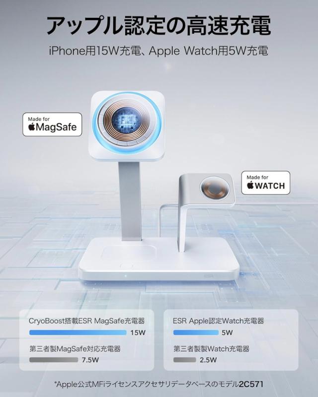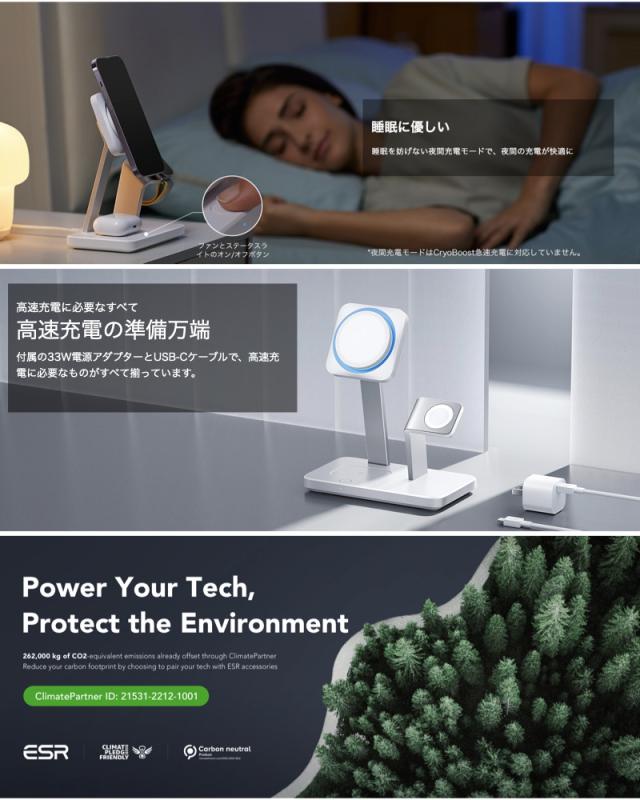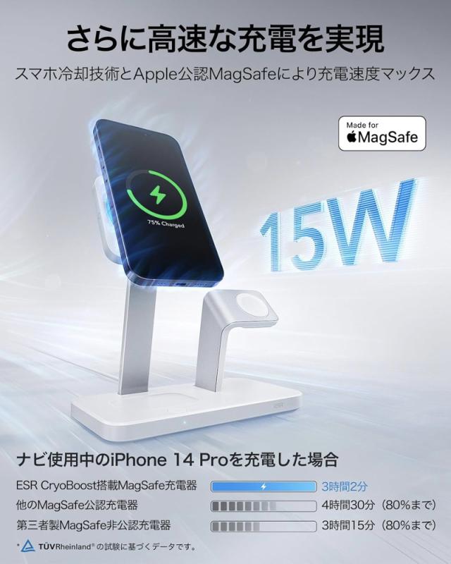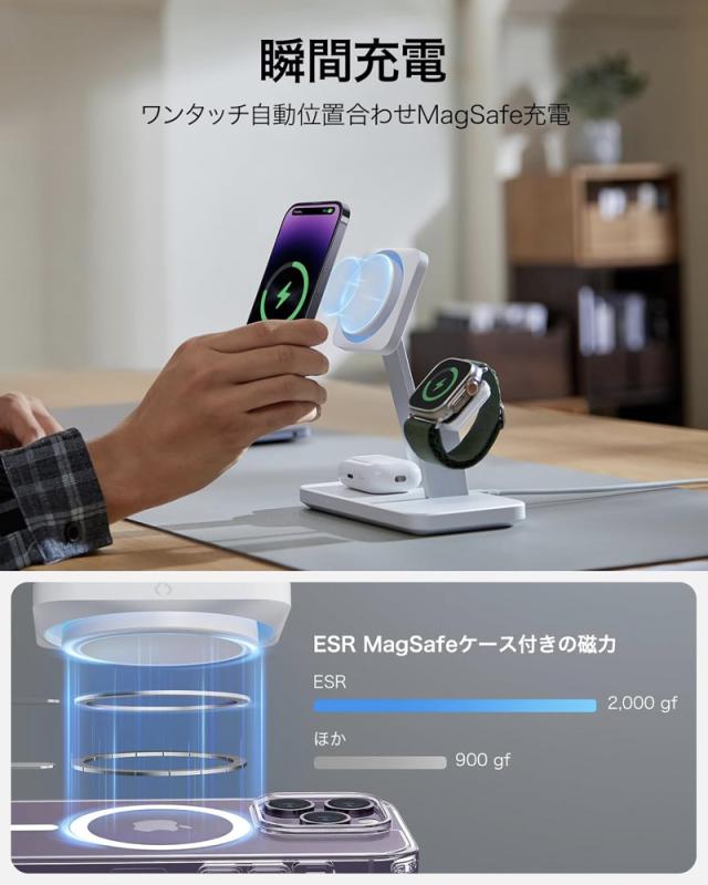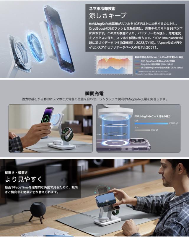 | ESR 3in1 Apple認定磁気ワイヤレス充電器 | 【公式・高速充電】 Apple認定の15W MagSafe iPhone充電と5W Apple Watch充電に対応し、より高速で安全な方法で必要なデバイスを充電できます。 【より涼しく、より速く】 CryoBoostファンと革新的な放熱部品がiPhoneを冷却つため、充電速度をマックスに保ち、充電中のiPhoneを快適に保ち、バッテリー寿命が長持ちします。 【瞬間充電】 強力な内蔵マグネットがiPhone、Apple Watch、AirPodsを自動で位置合わせし、ワンタッチで便利なMagSafe充電を可能にします。 【縦横両用】 iPhoneの充電パッドは、縦向き用にFaceTime、横向き用に動画を見ながら、ハンズフリーで充電するために最適な高さと角度に調節できます。 【睡眠に優しい】 ボタンを押すだけで夜間充電モードに切り替わり、睡眠をさまたげません。 【3in1マグネット充電】 iPhone、AirPods、Apple Watchを同時充電。iPhone 16/15/14/13/12シリーズ、AirPods Pro/3/2、 Apple Watch Ultra、Apple Watch 8/7/6/5/4/3/2/1シリーズ、Apple Watch SE 2/1に対応。 【Made for Apple Watch公認】 アップルウォッチ充電器は、セーフティが確保された信頼性の高い高速充電を提供するための公式認定済み。 【強力な磁気吸着】 1,000gの吸着力で、充電中のスマホを所定の位置にしっかり固定し、ウォッチ充電器とAirPods充電パッドに内蔵された磁石により、Magsafe充電に対応し、瞬時に位置合わせ可能。 【快適なビュー】 スマホの充電パッドは、ワイヤレス充電しながらでもFacetimeや動画を快適に見ることができる角度に人間工学を考慮して設計されています。 |