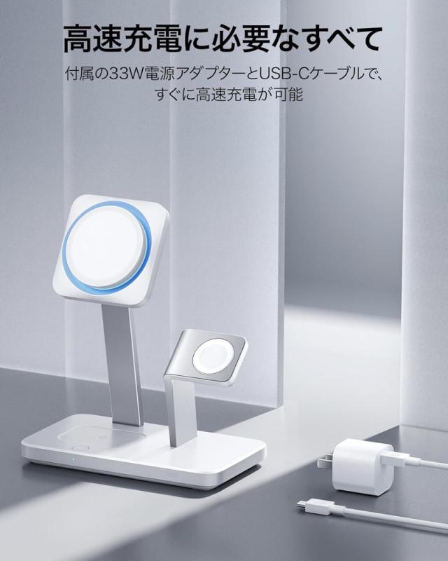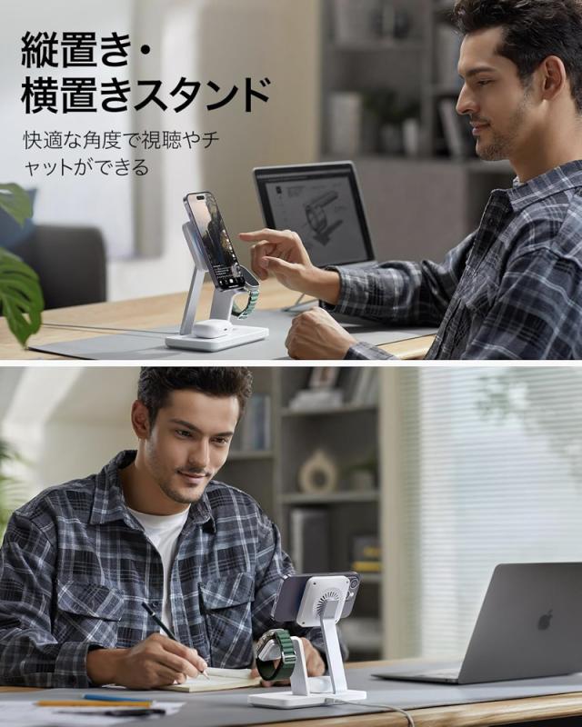 【公式・高速充電】Apple認定の15W MagSafe iPhone充電と5W Apple Watch充電に対応し、より高速で安全な方法で必要なデバイスを充電できます。【より涼しく、より速く】CryoBoostファンと革新的な放熱部品がiPhoneを冷却つため、充電速度をマックスに保ち、充電中のiPhoneを快適に保ち、バッテリー寿命が長持ちします。【瞬間充電】強力な内蔵マグネットがiPhone、Apple Watch、AirPodsを自動で位置合わせし、ワンタッチで便利なMagSafe充電を可能にします。【縦横両用】iPhoneの充電パッドは、縦向き用にFaceTime、横向き用に動画を見ながら、ハンズフリーで充電するために最適な高さと角度に調節できます。【睡眠に優しい】ボタンを押すだけで夜間充電モードに切り替わり、睡眠をさまたげません。【3in1マグネット充電】iPhone、AirPods、Apple Watchを同時充電。iPhone 16/15/14/13/12シリーズ、AirPods Pro/3/2、 Apple Watch Ultra、Apple Watch 8/7/6/5/4/3/2/1シリーズ、Apple Watch SE 2/1に対応。