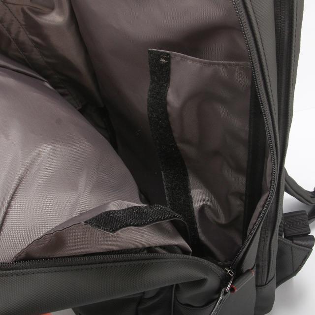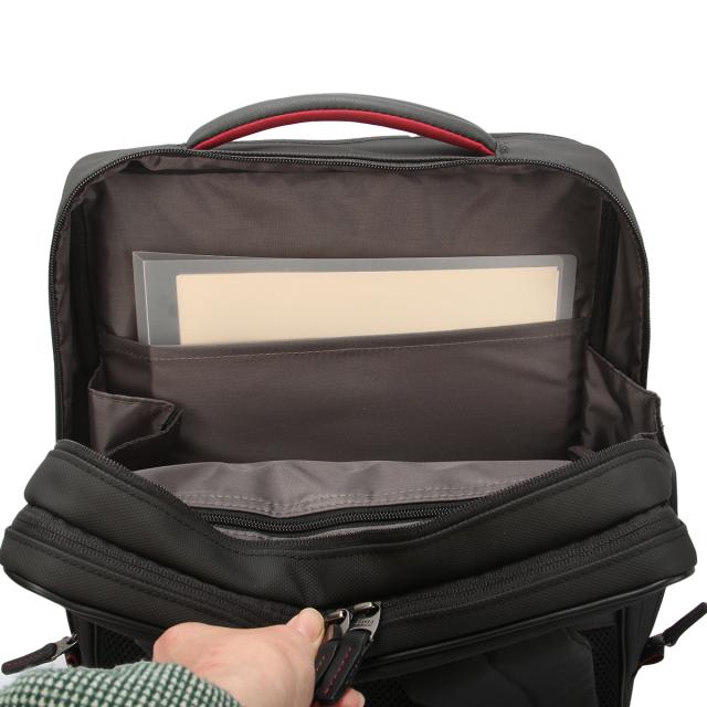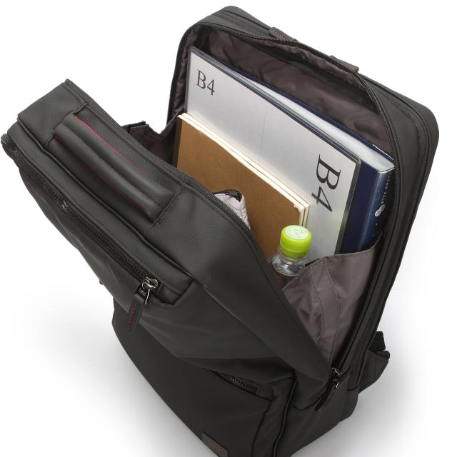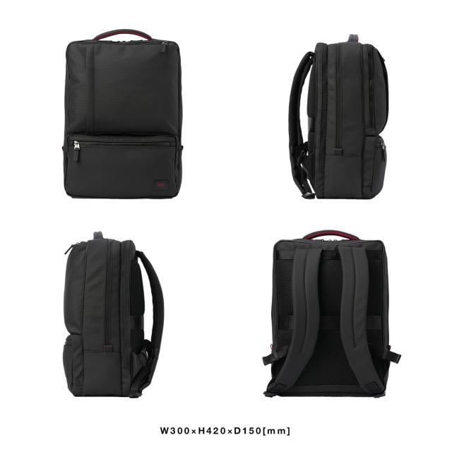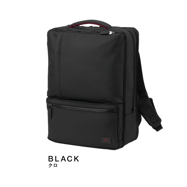 | 出張にも対応したタケオキクチのB4サイズビジネスリュック。オールブラックでどんなシーンでも使いやすいデザインですが、ポイントにさりげなくワイン色を施しています。収納機能抜群で、普段の通勤から短期出張まで幅広く使えるビジネスリュックです。 |