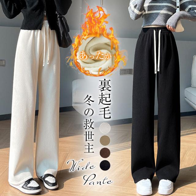 ワイドパンツ 裏起毛 ロングパンツ 秋冬 リブニットパンツ 美脚効果 ハイウエスト ゆったりロングボトムス