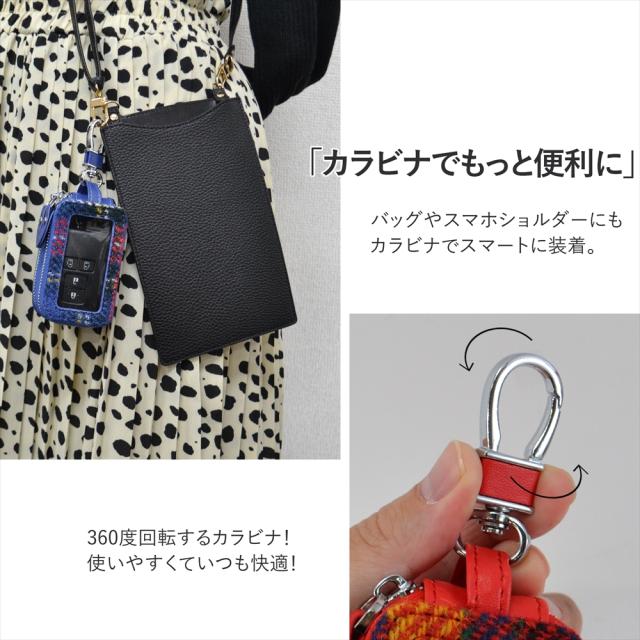 ●内側の落下防止チェーンや、外側のキーリング、360度回転式のカラビナなど、便利に・安心して使ってもらえるよう、細部にまでこだわった仕様。