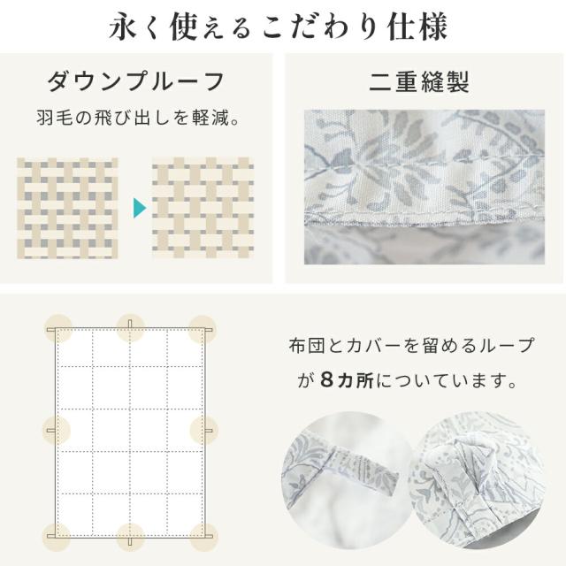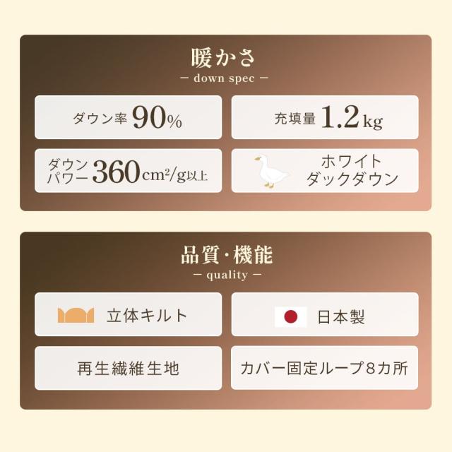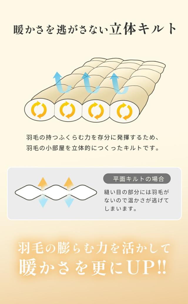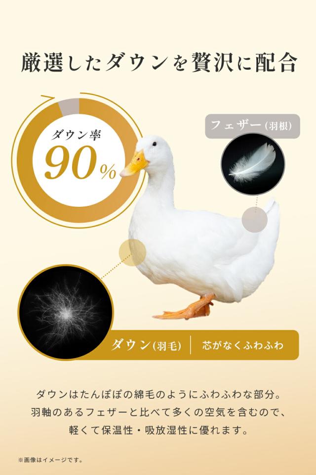 ・厳選したダウンを贅沢に配合 グースよりも体が小さく、食事も雑食性が強いため飼育がしやすく、比較的お求めやすい価格で流通しています。繊維そのものにハリ・コシが強くダックダウンのお布団は空気をうまくふくらませると嵩高のしっかり出たお布団になりやすいのが特徴です。お客様用にもおすすめです ・暖かさを逃がさない立体キルト羽毛が本来持つ膨らむ力を発揮するため、布団内に羽毛の小部屋を立体的に作ったキルトです。ふっくらと膨らんだ布団は、あたたかい空気をふんだんに含みますのであったかくお休み頂けます。 ・環境に配慮した再生繊維生地。軽やか&柔らかさをプラス軽くて柔らかな再生繊維(リヨセル)に、丈夫なポリエステルを配合し、さらなる耐久性をプラスしました。優れた吸湿性と通気性を兼ね備えました。 |