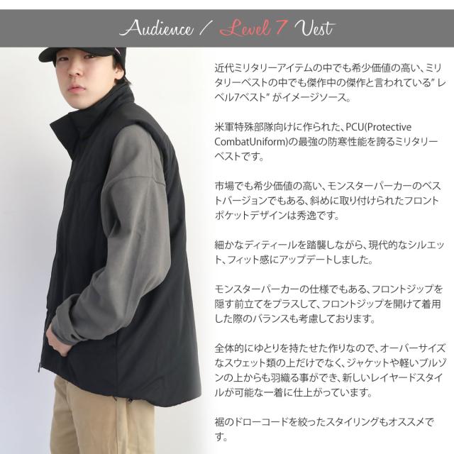 ミリタリーベスト オーディエンス 中綿 PCU LEVEL7 レベルセブン ベスト ロクヨンクロス Audience ( AUD7285 ) アウター ジャケット 60/40クロス ソロナデュポン 撥水性 防風性チョッキ ジレ メンズ