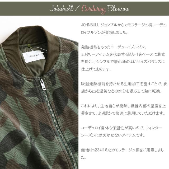 ジャケット ジョンブル Johnbull MA-1 ヒート コーデュロイ 中綿 ブルゾン ( jm234l16 ) 迷彩柄 カモフラージュ フライトジャケット ミリタリー 吸湿発熱 HOTJOIN メンズ レディース ユニセックス 重ね着 リブ カットソー おしゃれ アーベン 普段使い 実用的 羽織り