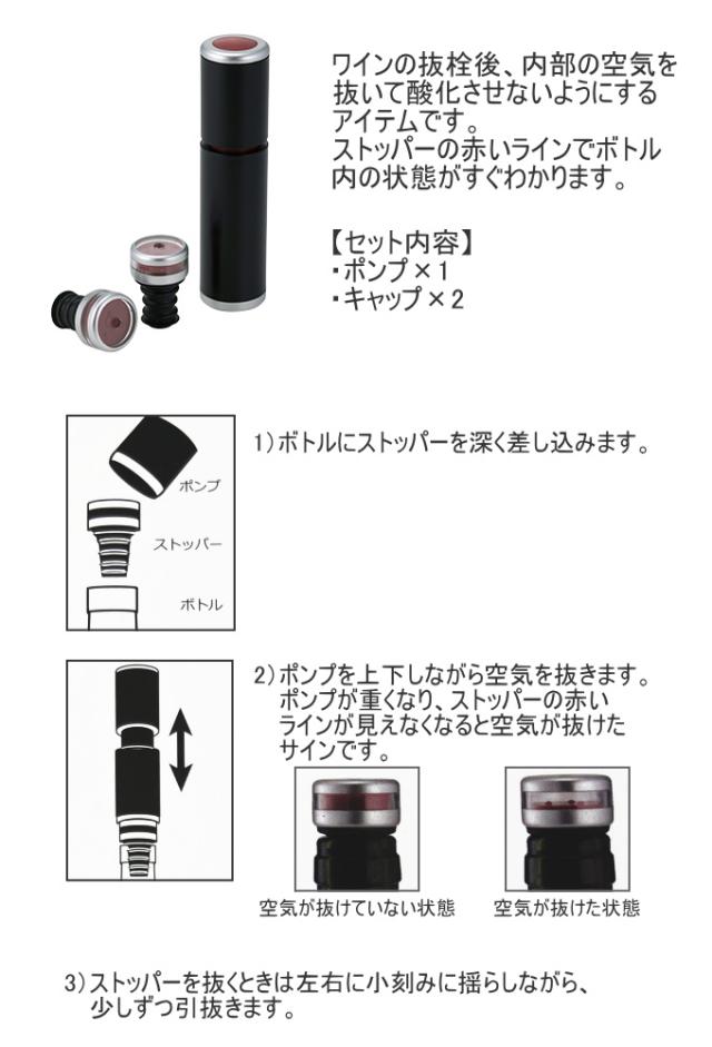 ワインの抜栓後、内部の空気を抜いて酸化させないようにするアイテムです。 ストッパーの赤いラインでボトル内の状態がすぐわかります。 |