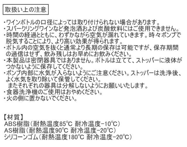 ・ワインボトルの口径によっては取り付けられない場合があります。 ・発泡酒および炭酸飲料にはご使用できません。 ・本製品は密閉器具ではありません。ボトルは立てて、ストッパーに液体がつかないように保存してください。 ・食洗機のご使用はおやめください。 |
