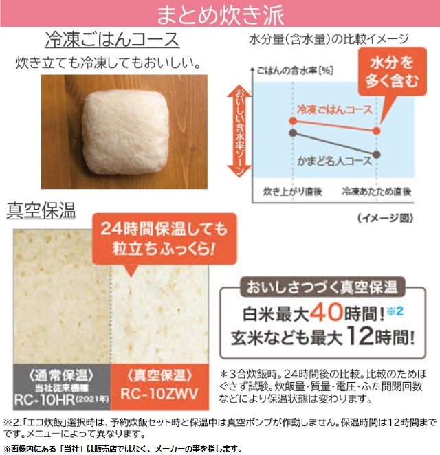 ※保証期間内に内側のコーティングがはがれた場合は新品とお取り替えいたします(取扱説明書の記載事項にそわない使い方をした場合は対象外となります)。方式 真空IH 最大炊飯容量 1.0L(約5.5合) 消費電力 1420W 1回当たりの炊飯時消費電力量 176.3Wh(エコ炊飯)※1
