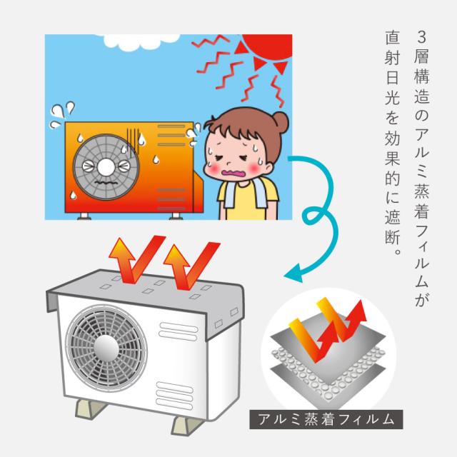 エアコンの冷却効果が上がる、室外機用サンガード。太陽光の反射率が高い「アルミ蒸着フィルム」が直射日光を効果的に遮断。表面温度を抑え冷房運転中の室外機の負担を軽くします。ホコリ・汚れ対策にも◎。