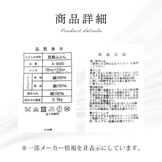 | ・シルクの魅力 タンパク質を主成分とする繭糸から作られるシルク生地はアミノ酸を含み、皮膚細胞を活性化させる作用があるため、健康的なお肌や髪を保ちます。 ・贅沢な素材全体シルク100%贅沢を極め、側生地から中綿まで素材全体に国産近江真綿(シルク)100%を使用しました。美しい光沢感だけでなく、吸湿性、通気性、保温性に優れたシルクが、心地よい眠りを誘います。 ・真綿布団とはからだにやさしいシルク綿を用いた真綿布団は、昔から高級布団として知られています。真綿とは、繭を煮て引き延ばして、絹を綿(わた)にしたものです。伝統の技により丹念に何百回も引き延ばしを繰り返すことで、より吸湿性・保湿性・ドレープ性に優れた沿いの良い真綿ふとんに仕上げます。 ・柔らさと耐久性を兼ね備えた19匁19匁のシルクは、16匁に次いで軽くて柔らかく、肌への負担が少なく、敏感肌の方にもおすすめです。やや厚みがあり、耐久性が高いので長持ちします。 ・季節に合わせて、1年中使えるシルクは天然繊維の中で最も細く最も長い繊維であり、吸湿性は綿の約1.5倍。ムレ感がなく爽やかで夏も冬も常に快適にご使用いただけます。夏は1枚で、冬は中掛けふとんとしてもあたたかくお使いいただけます。 ・わずか約1.0kgの軽量素材シルクは綿に比べて非常に軽い素材です。布団の重みが気にならないため、体への圧迫感がなく、快適にお使いいただけます。 ・安心で高品質な日本製丁寧に国内生産されています。シルク繊維の中でも特に高品質な原料を厳選。伝統の技術と感性を受け継いだ職人達による加工が、快適な生活をお届け致します。 | |
