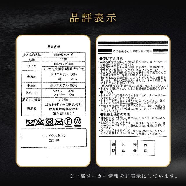 羽毛 敷きパッド シングル 高級 リサイクルダウン 1.2kg 日本製 100×200 当社限定 ダウンパッド ダウン 敷きパッド ボリューム