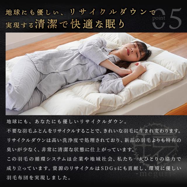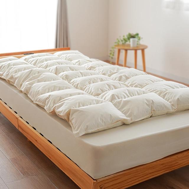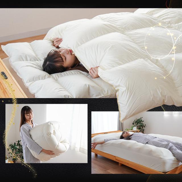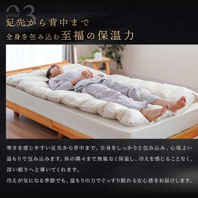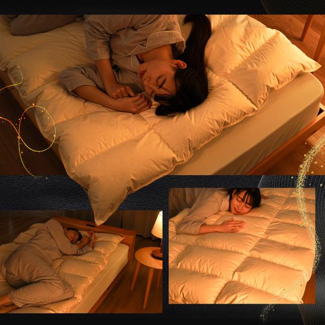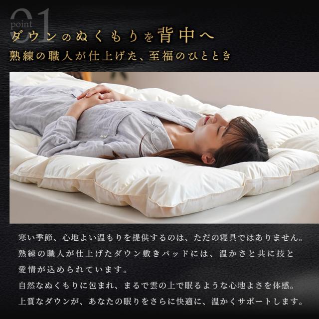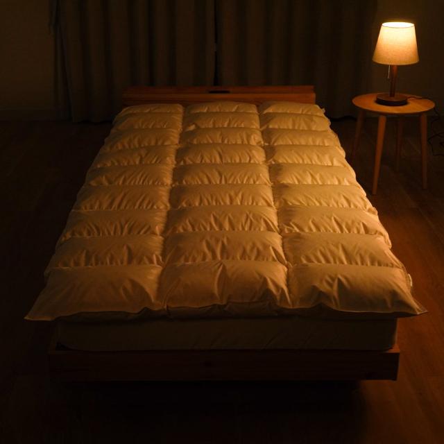 | ・ダウンのぬくもりを背中へ。熟練の職人が仕上げた、至福のひととき 寒い季節、心地よい温もりを提供するのは、ただの寝具ではありません。熟練の職人が仕上げたダウン敷きパッドには、温かさと共に技と愛情が込められています。自然なぬくもりに包まれ、まるで雲の上で眠るような心地よさを体感。上質なダウンが、あなたの眠りをさらに快適に、温かくサポートします。 ・羽毛の偏りを徹底防止。立体キルトで温かさをキープダウンの温かさが長持ちするためには、羽毛の偏りを防ぐことが重要です。羽毛が本来持つ膨らむ力を発揮するため、布団内に羽毛の小部屋を立体的に作ったキルトです。 ・足先から背中まで。全身を包み込む至福の保温力寒さを感じやすい足先から背中まで、全身をしっかりと包み込み、心地よい温もりで包み込みます。体の隅々まで無駄なく保温し、冷えを感じることなく、深い眠りへと導いてくれます。冷えが気になる季節でも、温もりの力でぐっすり眠れる安心感をお届けします。 ・普段お使いの寝具にプラスワンお使いの敷き布団の上にこの羽毛敷きパッドを敷くだけで、睡眠環境が格段に向上。適度な厚みとハリがあり、身体をしっかり支えつつ、快適にご使用いただけます。また伸縮性のあるカバーに入れ込むだけでふかふかな敷き布団に早変わり。普段お使いのお気に入りの寝具と一緒に使うことができます。 ・地球にも優しい、リサイクルダウンで実現する清潔で快適な眠り地球にも、あなたにも優しいリサイクルダウン。不要な羽毛ふとんをリサイクルすることで、きれいな羽毛に生まれ変わります。リサイクルダウンは高い洗浄度で処理されており、新品の羽毛よりも特有の臭いが少なく、非常に清潔な状態に仕上がっています。この羽毛の循環システムは企業や地域社会、私たち一人ひとりの協力で成り立っています。資源のリサイクルはSDGsにも貢献し、環境に優しい羽毛布団を実現しました。 ・国内の”自社工場”で製造しています。ダウンの充填から、側生地の縫製、梱包・出荷作業を国内の自社工場で行っています。 | |