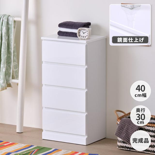 【12/23限定!ポイント10倍!】 幅40 奥行30 4段 完成品 チェスト タンス たんす 箪笥 ランドリー収納 洗面所 バスルーム サニタリー 衣類 タオル 洋服 収納 引き出し 薄型 スリム 隙間 白 ホワイト 鏡面 シンプル モダン SOFEE ISSEIKI