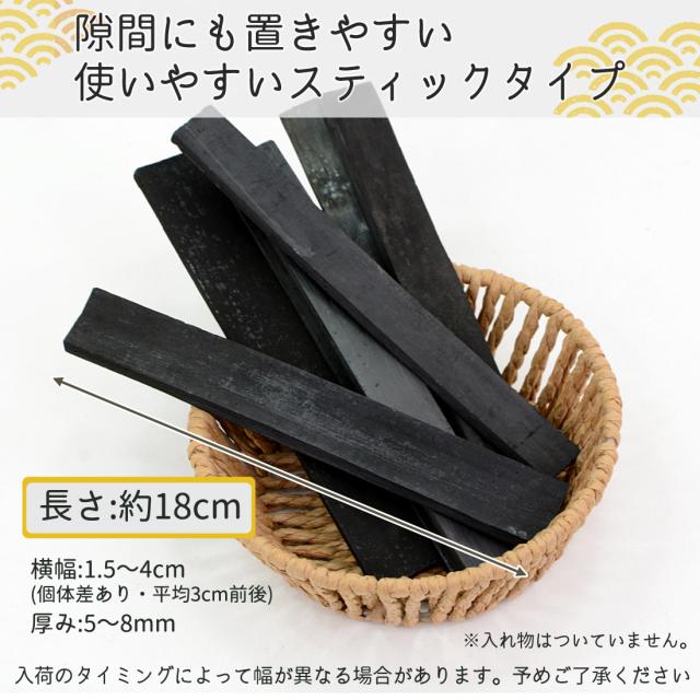 立ててインテリアとして飾ったり、隙間にも置きやすいスティックタイプ <竹炭> 竹炭には、空気の脱臭や除湿、水分のろ過・浄化効果があるとされています。 微細な無数の穴が開いた構造により、におい、湿気、汚れなどを吸着する性質を持っています。 そのため、消臭・調湿だけでなく、飲料水やお風呂の水の浄化など、さまざまな用途で活用できる便利なアイテムです。 小さなお子様、ペットがいる環境でも使いやすいエコな消臭グッズです。 ■商品名:四万十の竹炭(特大サイズ) ■用途:消臭 脱臭 除湿 竹炭インテリア 炊飯 ミネラル補給 ミネラル水 飲料水 押入れ クローゼット 下駄箱 トイレ 玄関 園芸用 家庭菜園 車等の脱臭や調湿 ■原料:四万十の竹材 ■内容量:15〜16本(13〜14本+輸送時保証2本) ■サイズ:長さ(約)18cm、横幅(約)1.5〜4cm、厚み(約)5〜8mm前後 ・昔ながらの土窯で高温処理しています。各サイズ同じものはございません。 ・本商品の横幅には個体差があります。最も細いもので約1.5cm、最も太いもので約4cmです。 平均的には3cm前後の商品が多いですが、入荷のタイミングによって幅が異なる場合があります。予めご了承ください。 【炭焼き作業所について】 こちらの商品は、四万十市の共同作業所さんの商品です。障害を持たれている方の就労支援の一環として社会福祉の向上を目的に活動されています。 一本一本竹材を山から切り出し、丁寧に土窯に入れ、創意工夫をしながら仲間を大事に、そして安全には特に気を付けながら作業を行っています。 四万十の山合の集落で心を込めて焼いた竹炭をどうぞお買い求めください。当社は、社会福祉活動を応援いたします。 <その他> 竹炭は非常に割れやすくなっていますのでお取扱にはご注意ください。 輸送時、緩衝材を複数枚入れておりますが割れ、欠けが発生する場合がございます。 割れ欠けがありましても効果に変わりはございません。輸送保証として2本サービスしています。 ※お取り扱いの際、炭の粉が手に付く場合がございますので手袋のご着用をお勧めしています。また、服に着かないようにご配慮ください。 ※標準サイズ(約6cm)、大サイズ(約13cm)、特大サイズ(約18cm)を取り揃えております。気に入っていただけましたら他のサイズも宜しくお願いいたします。[2411] |