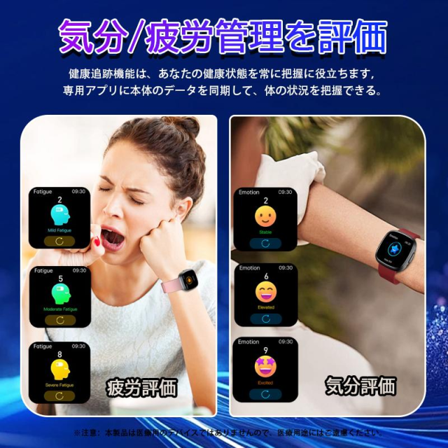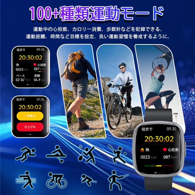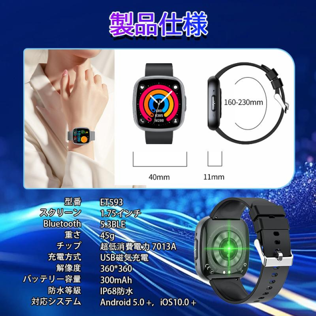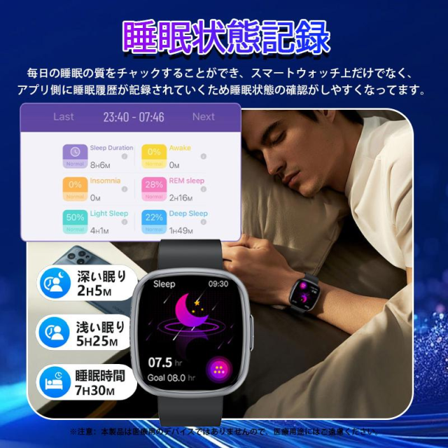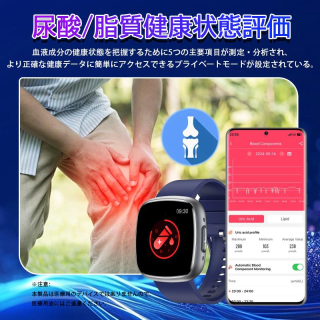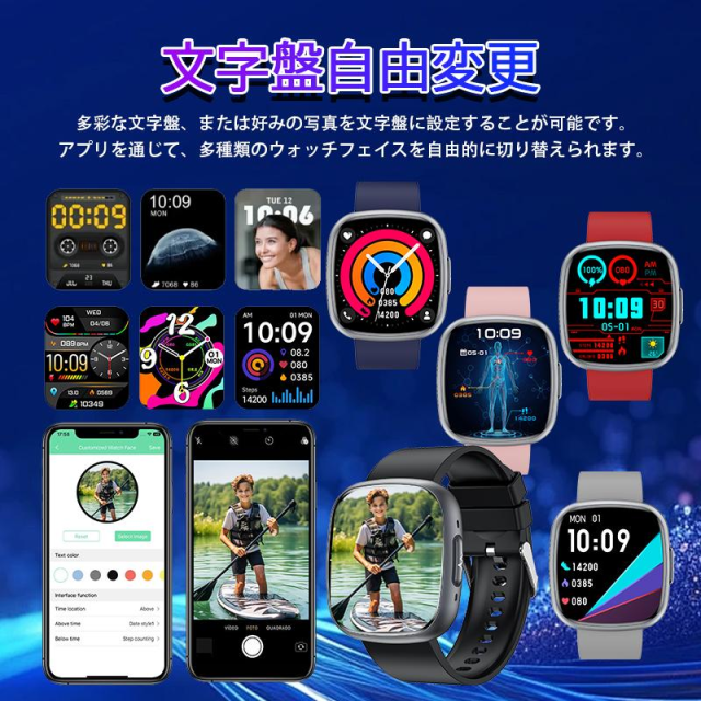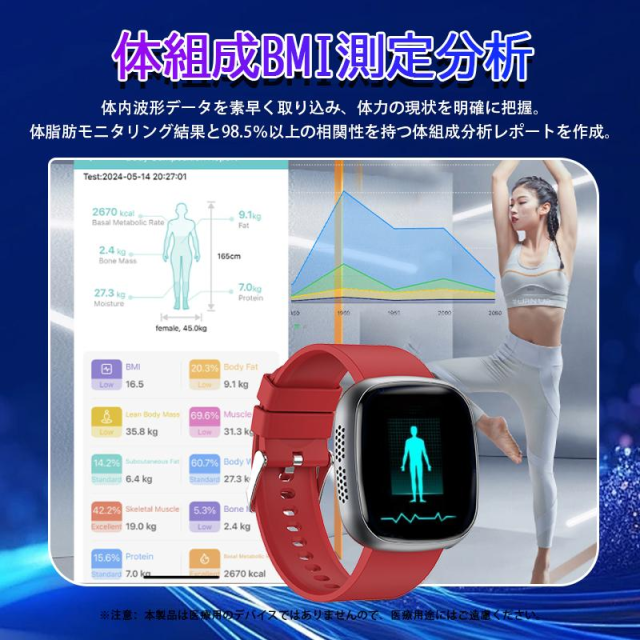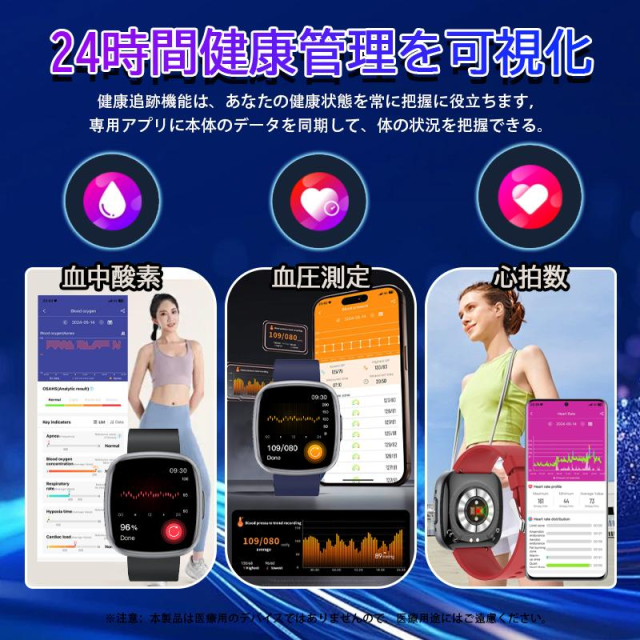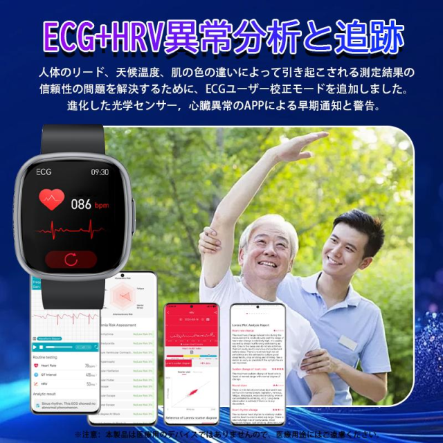 ●24H健康管理:血糖、血圧、ECGなど多機能測定、通話可能、カロリー、24時間体温監視、アラート、AI診断測定、睡眠監視や心拍数などの測定機能付き