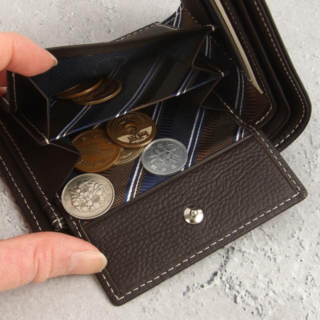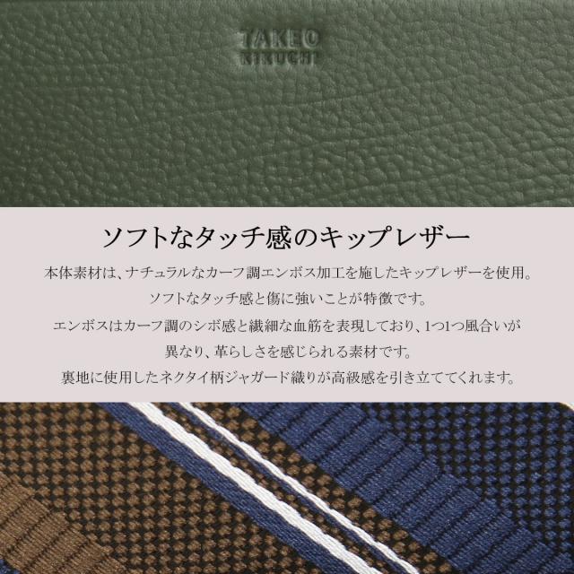 | ソフトなキップレザーを使用した、薄マチでスッキリとしたタケオキクチの二つ折り財布です。内装のカラーコンビと、裏地に使用したネクタイ柄ジャガード織り素材がポイントです。 財布の内側には札入れが2つ、小銭入れ、ポケットが3つあります。カード段は4つに加え、札入れ内にもカード段が2つあり、多くのカードを持ち歩くことができます。小銭入れは仕切り付きで、硬貨を分けて収納できます。マチは風琴マチ仕様。風琴マチとは、アコーディオンの様にマチを外側に折られているマチです。内側にマチを折りこむササマチよりも、有効幅が広くなるため、引っ掛かりがなく紙幣を出し入れすることができます。 本体素材は、ナチュラルなカーフ調エンボス加工を施したキップレザーをベースに使用しています。ソフトなタッチ感とキズ等に強いことが特徴です。エンボスはカーフ調のシボ感と繊細な血筋を表現しており、一つ一つ風合いが異なり、革らしさを感じられる素材です。 |