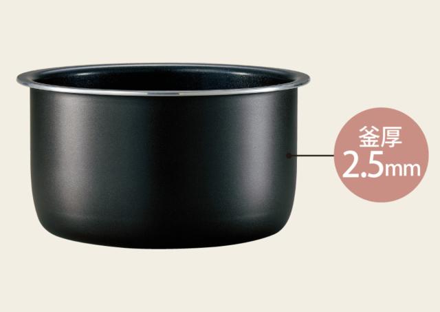 熱が側面まで伝わりやすい広く浅めの形状の「黒厚釜(2.5mm)」は、お米がムラなく炊き上がります。
