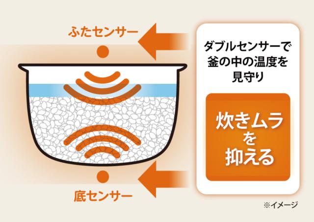 底とふたについている2つのセンサーで釜内の温度を見張ります。沸とうを正確に検知するので、ごはんのアルファ化を促進し、ふっくらおいしく炊き上げます。