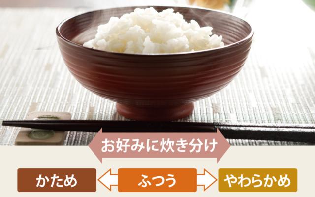 ご家庭のお好みにあわせ、ふつう・やわらかめ・かためと炊き方が選択できます。