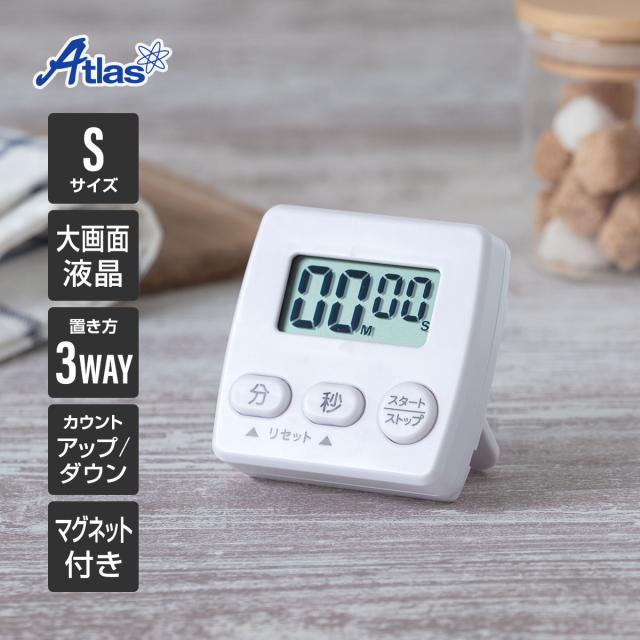 アトラス デジタルキッチンタイマー マグネット付き スタンド付き ストラップ穴 カウントアップ カウントダウン 見やすい 大画面 Sサイズ ホワイト AT-S03WH