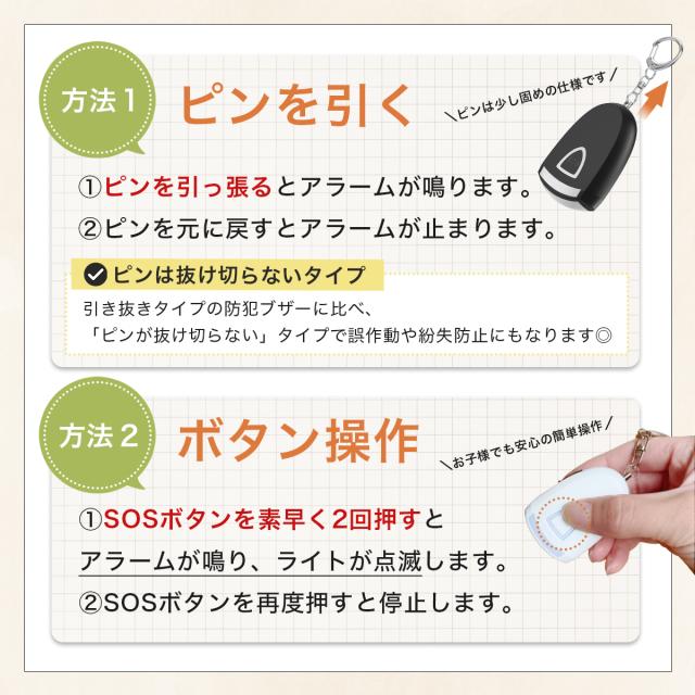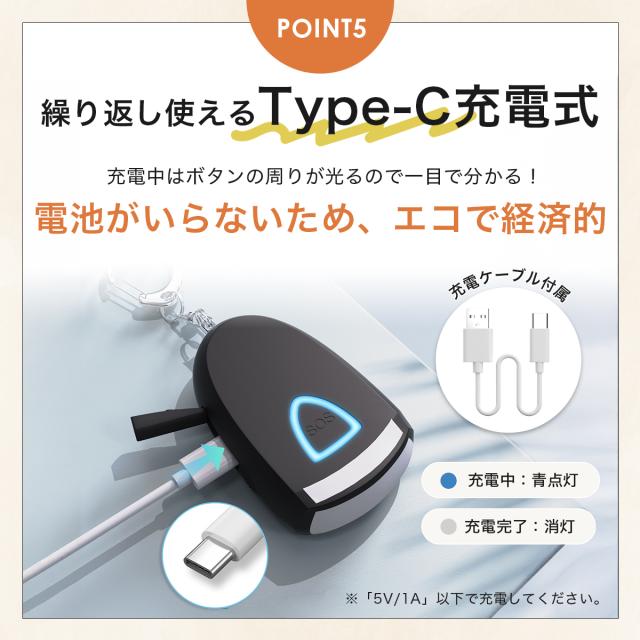 - 防犯ブザーですが、充電式でLEDライト付きだったので購入しました。音も大きくて何かあった時不審者を撃退できると期待しています。