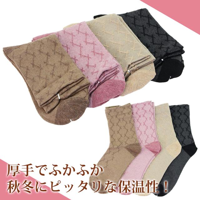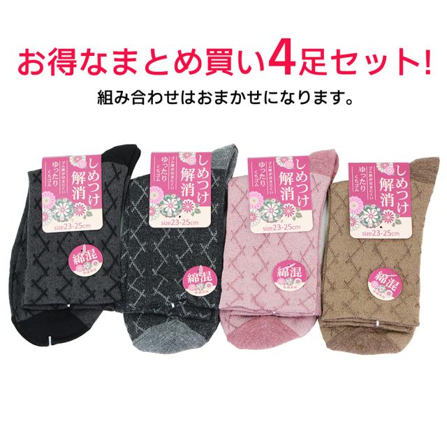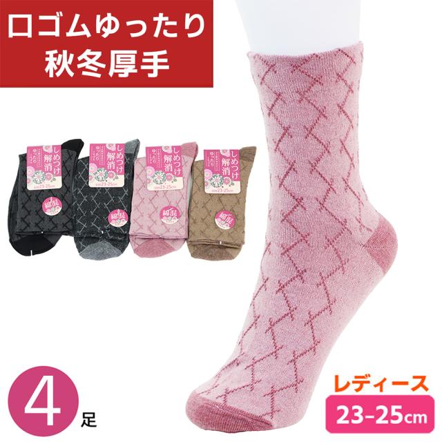 口ゴムゆったり 秋冬春 女性用 ソックス 4足セット しめつけ解消 靴下 秋冬 保温 厚手 地柄 履き口ふんわり【メール便送料無料】 やわらか口ゴム ふかふか あったか かわいい レディース 女性 カジュアルソックス くつした 23-25cm 婦人 クルー丈 綿混素材 agesugi_sfa