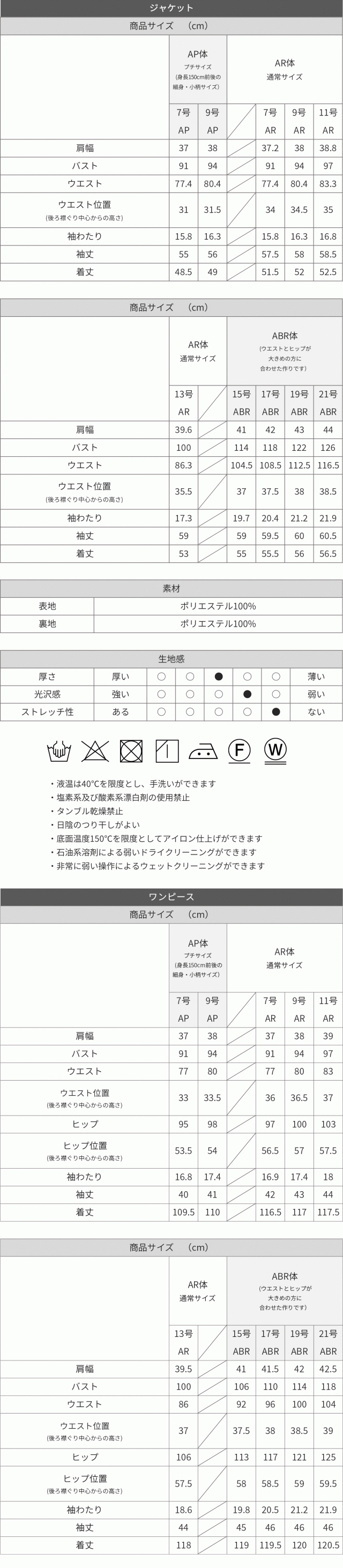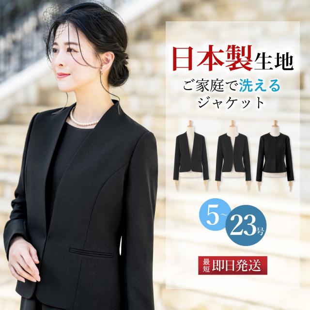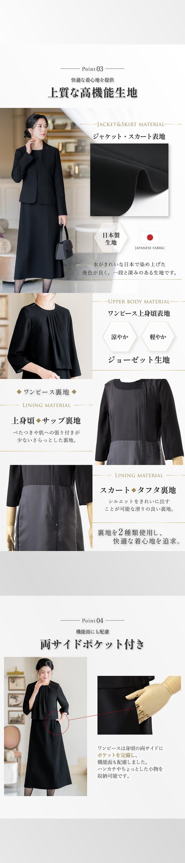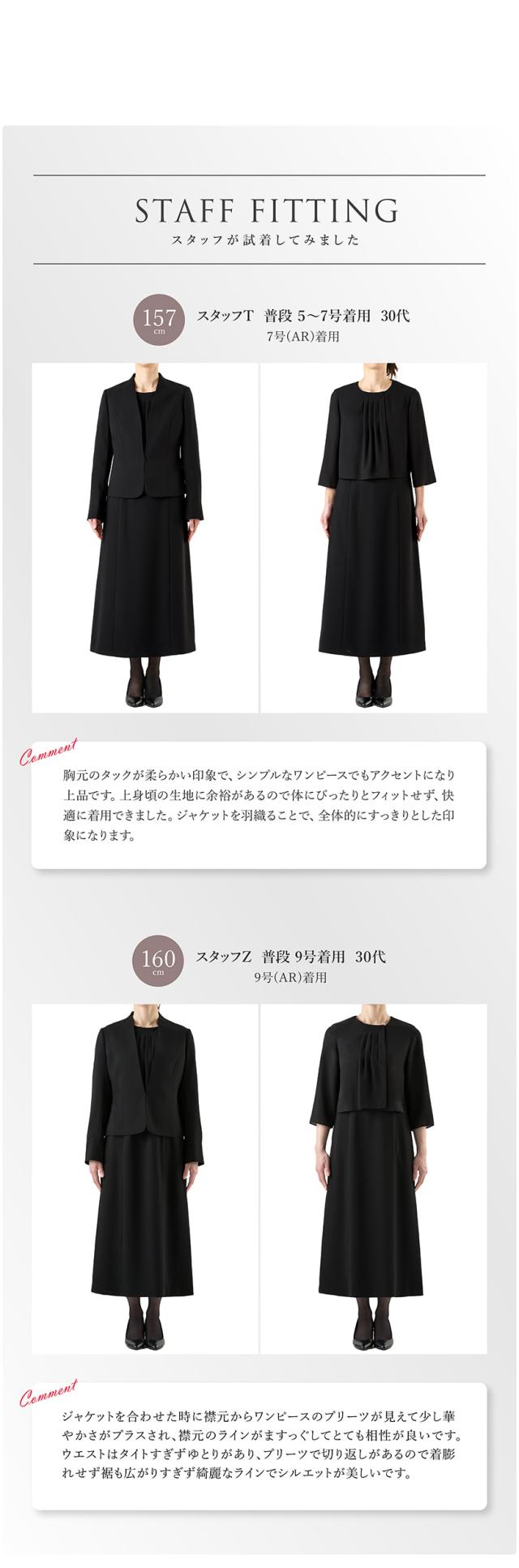 説明 | 礼服、喪服対応のブラックフォーマルスーツ。 シンプルなカラーレスジャケットとアンサンブル風のロングワンピースの2点セット。 ジャケットはすっきりとしたシルエットで、フロントを閉めても前が開きすぎないよう調整しました。 ワンピースは、上下異素材を使用したアンサンブルデザインです。 上身頃は薄手の軽やかな生地を使用し、タックフレアで揺れ感を演出。 スカート部分はジャケットと同素材で、ジャケットと合わせて着ると上下まとまりのある上品な仕上がりに。 ワンピースは前開きファスナー仕様で脱ぎ着のしやすさが抜群。 手の届きやすい位置にファスナーがあることでひとりでもラクに着脱が可能です。 また、大きく開く前開きのため、授乳中のかたにもおすすめです。 ワンピースの上身頃はべたつき・肌へのはりつきの少ない、さらっとした風合いのサップ裏地、 スカート部分はシルエットをキレイに出すため、滑りの良いタフタ裏地を使用しています。 また、ご家庭でお洗濯できるので常に清潔な状態でご着用いただけるのも魅力のひとつです。 |