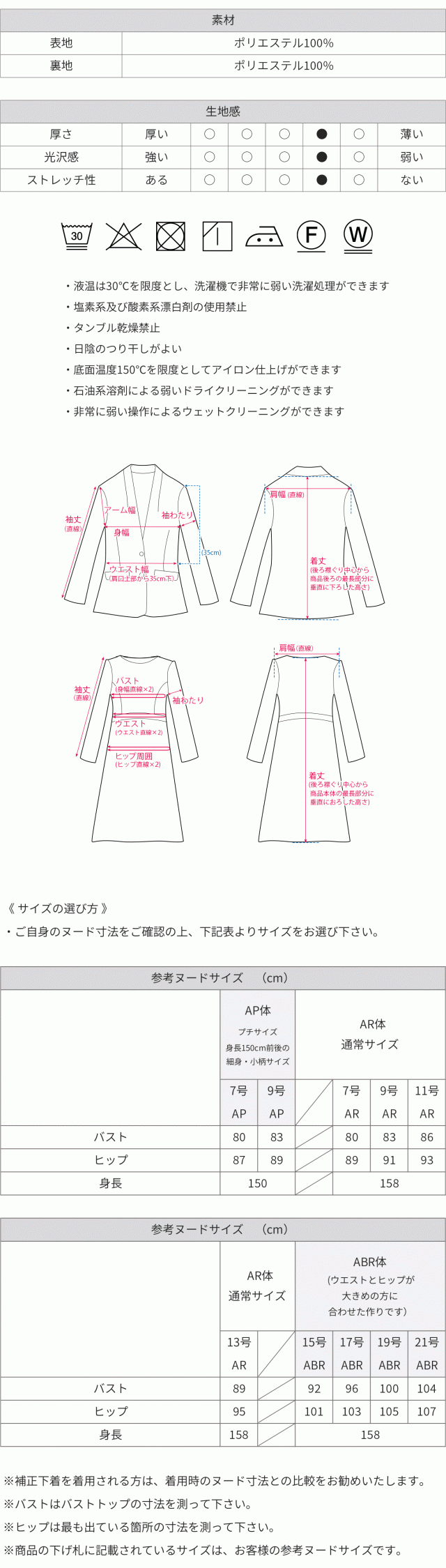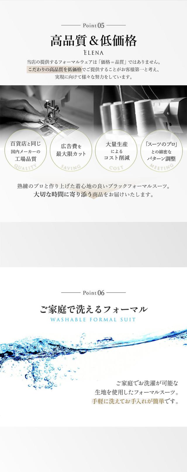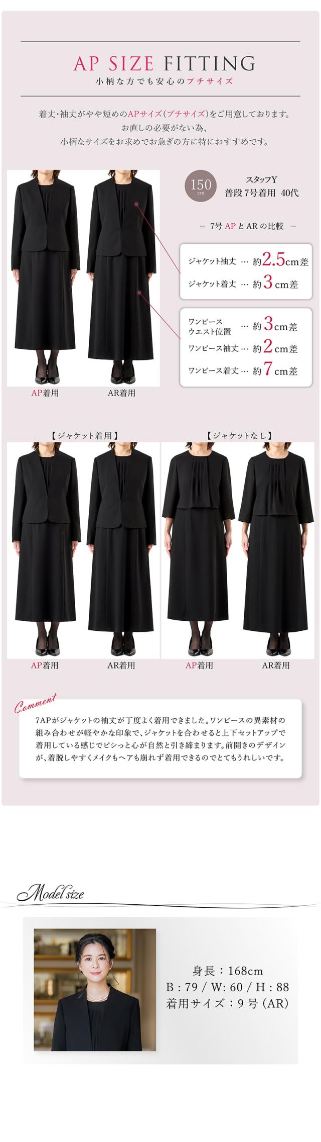説明 | 礼服、喪服対応のブラックフォーマルスーツ。 シンプルなカラーレスジャケットとアンサンブル風のロングワンピースの2点セット。 ジャケットはすっきりとしたシルエットで、フロントを閉めても前が開きすぎないよう調整しました。 ワンピースは、上下異素材を使用したアンサンブルデザインです。 上身頃は薄手の軽やかな生地を使用し、タックフレアで揺れ感を演出。 スカート部分はジャケットと同素材で、ジャケットと合わせて着ると上下まとまりのある上品な仕上がりに。 ワンピースは前開きファスナー仕様で脱ぎ着のしやすさが抜群。 手の届きやすい位置にファスナーがあることでひとりでもラクに着脱が可能です。 また、大きく開く前開きのため、授乳中のかたにもおすすめです。 ワンピースの上身頃はべたつき・肌へのはりつきの少ない、さらっとした風合いのサップ裏地、 スカート部分はシルエットをキレイに出すため、滑りの良いタフタ裏地を使用しています。 また、ご家庭でお洗濯できるので常に清潔な状態でご着用いただけるのも魅力のひとつです。 |