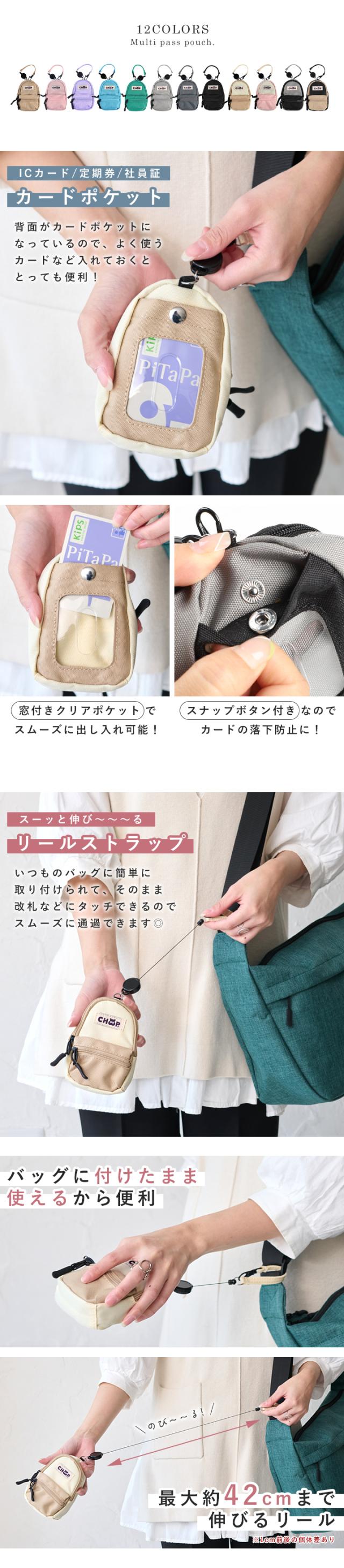 | 備考 | 通勤通学に定期やICカードを収納して持ち運べる リールストラップ付きのパスケース。 窓付きのクリアポケットでスムーズに カードを出し入れすることができ、 スナップボタンを留めれば落下防止に! バッグの中で散らばりがちな小物を収納できる スペースがあり、内側にはキーリングも付いて いるので貴重品類をまとめて収納可能◎ ストラップはリールパーツ付きで スーっと伸ばして改札にタッチできるので いつものバッグに付けたままでも使用できる! |