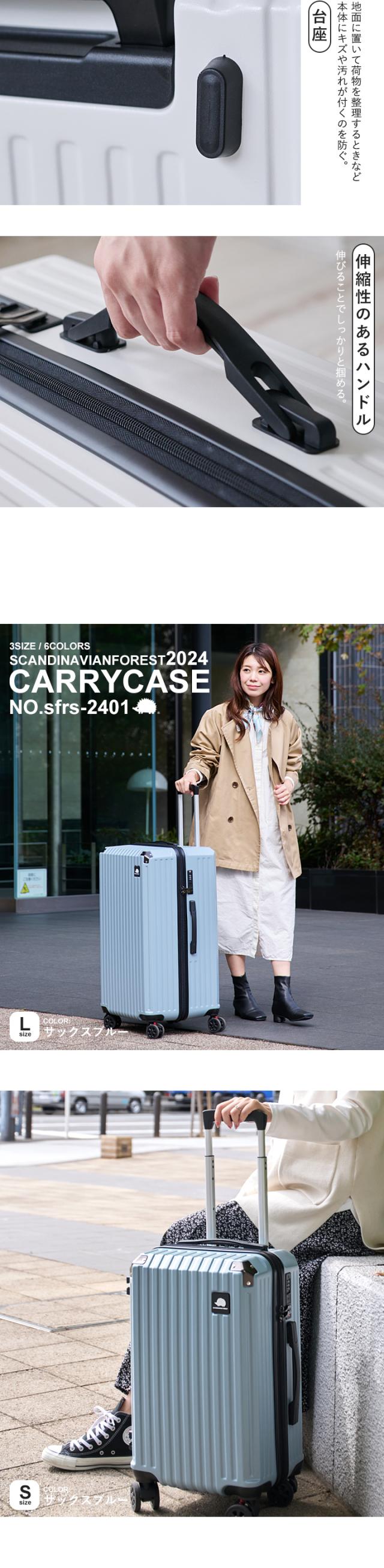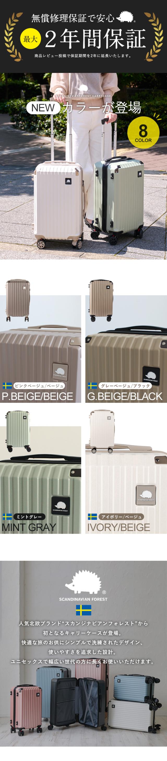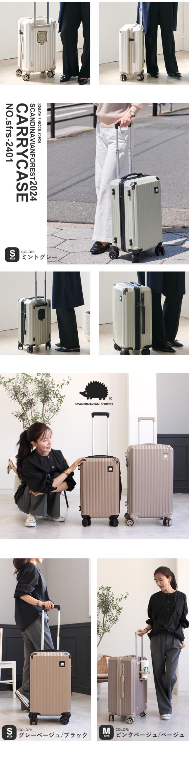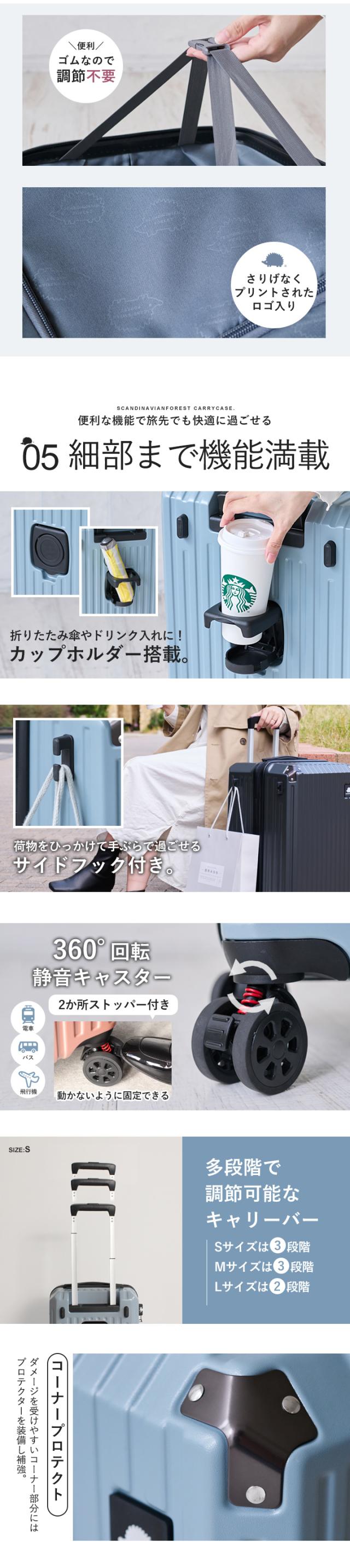 | 備考 | 人気北欧ブランド「SCANDINAVIAN FOREST」から初のスーツケースが登場しました。 傷が目立ちにくいエンボス加工が施された軽量で丈夫な素材を使用して、 可愛いハリネズミのロゴがアクセントになったシンプルなデザインは男女問わず幅広い世代におすすめです。 1泊?10泊まで日程に合わせて選べる3サイズ展開! 高品質のファスナーで開け閉めもスムーズ!キャスターは360度回転し、便利なストッパー機能も付いています。 お土産などを引掛けられるサイドフックやカップホルダー付きで使いやすい機能満載! |