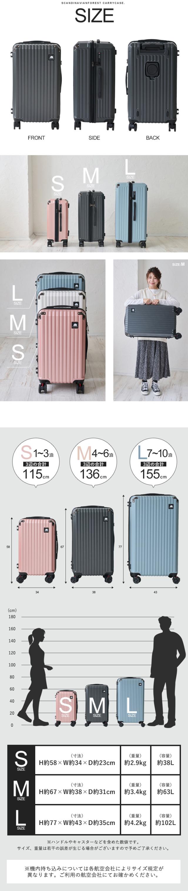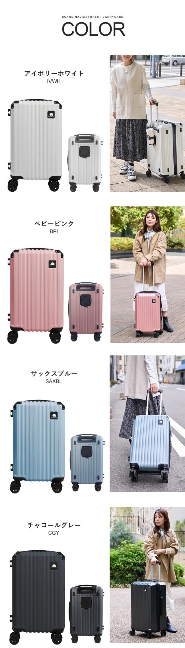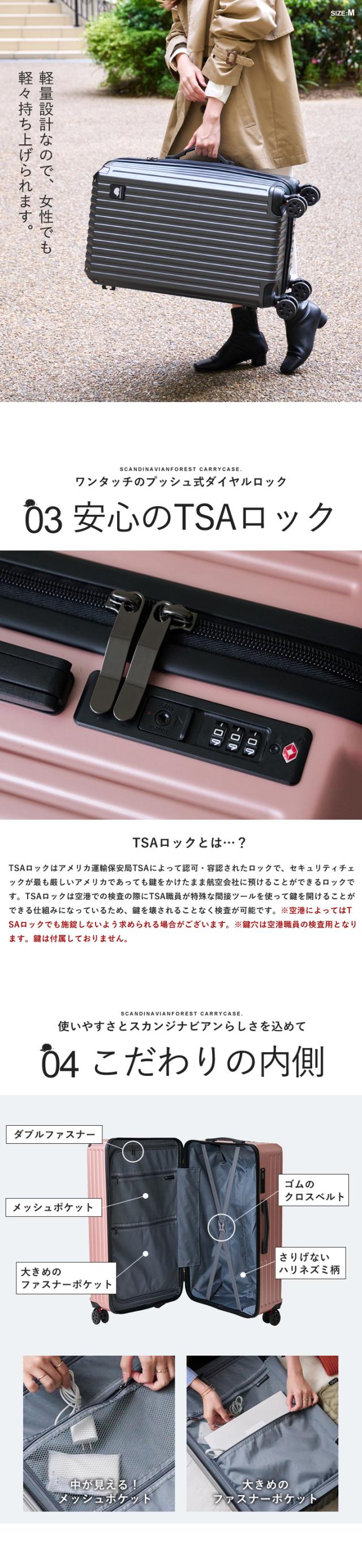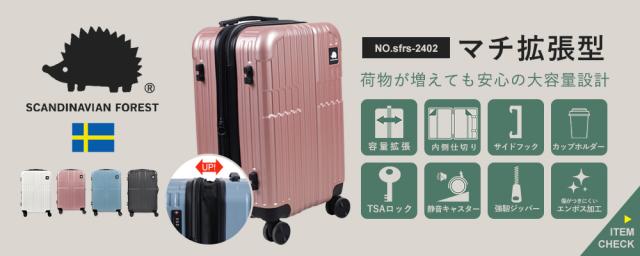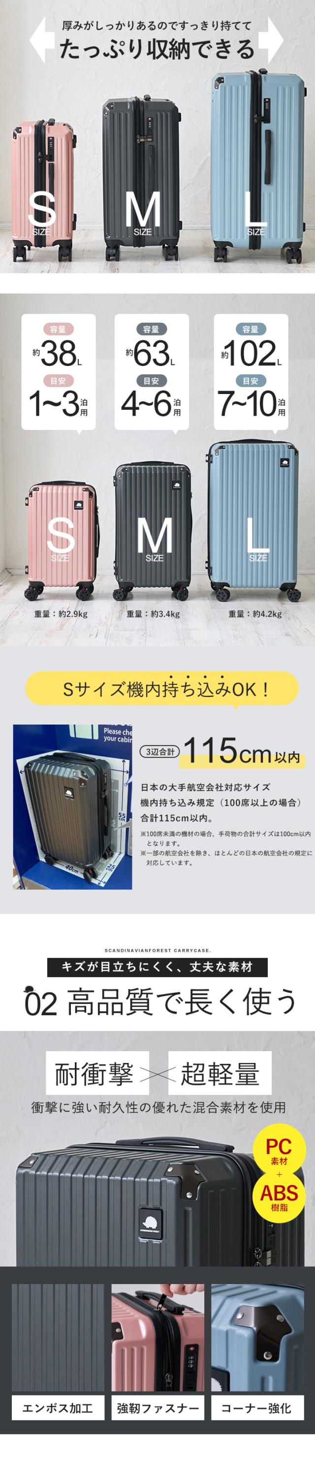 | 備考 | 人気北欧ブランド「SCANDINAVIAN FOREST」から初のスーツケースが登場しました。 傷が目立ちにくいエンボス加工が施された軽量で丈夫な素材を使用して、 可愛いハリネズミのロゴがアクセントになったシンプルなデザインは男女問わず幅広い世代におすすめです。 1泊?10泊まで日程に合わせて選べる3サイズ展開! 高品質のファスナーで開け閉めもスムーズ!キャスターは360度回転し、便利なストッパー機能も付いています。 お土産などを引掛けられるサイドフックやカップホルダー付きで使いやすい機能満載! |