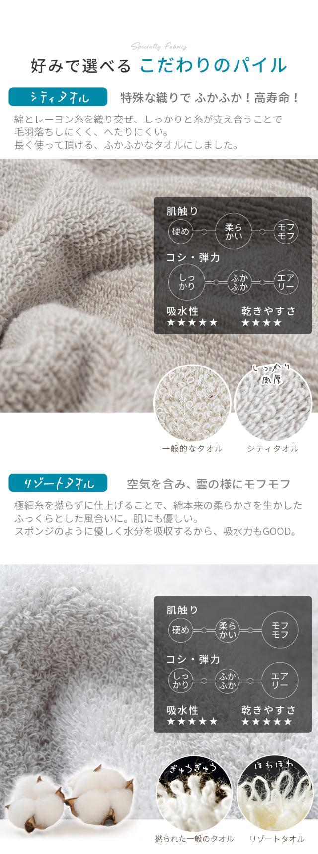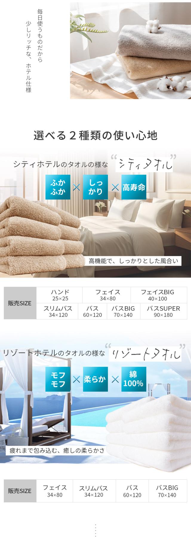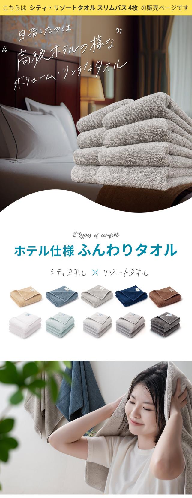 - リゾートホテル仕様にしましたが、本当にふわふわで肌触りもよく吸水力もとても良いです。ミニバスタオルでも全身拭けますし、頭に巻く時も幅が狭いので巻きやすいです。