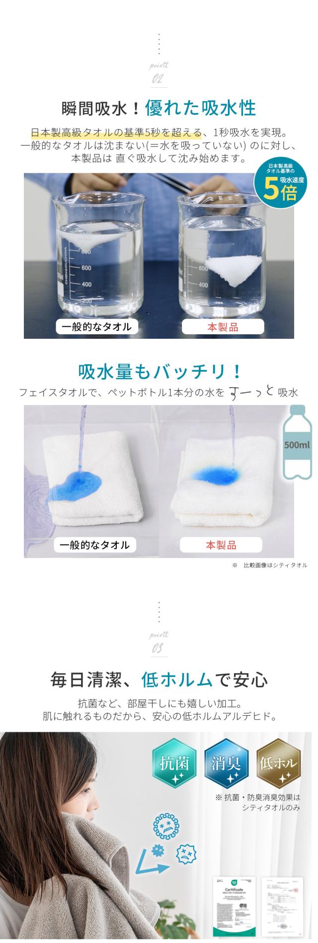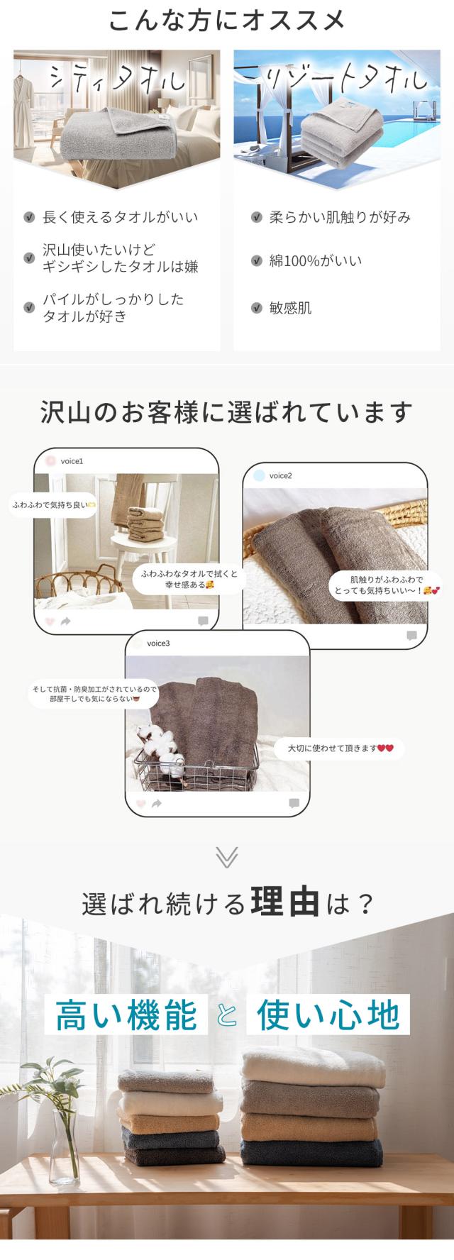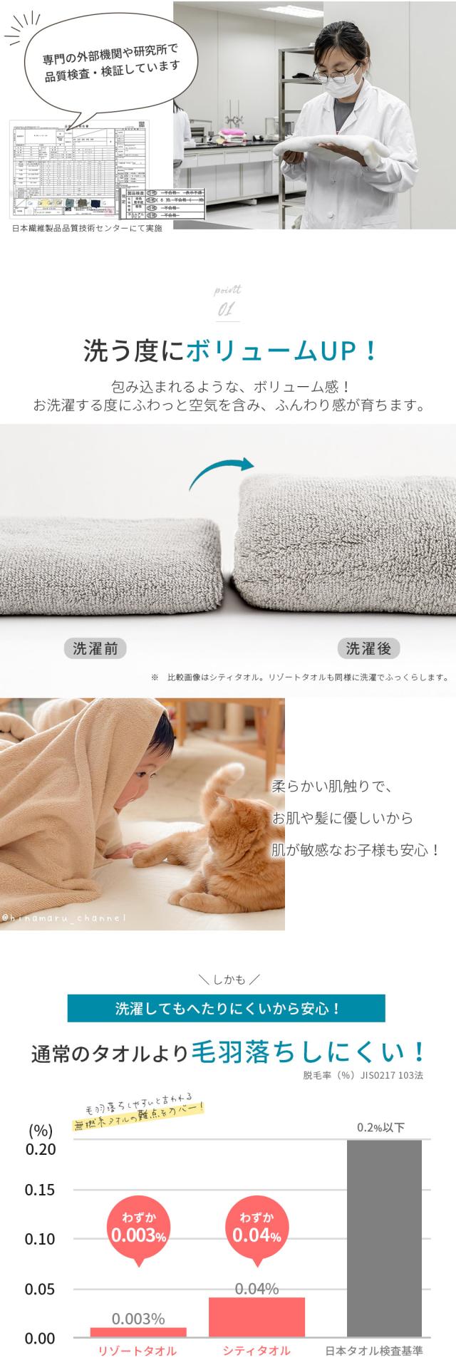 - リゾートホテル仕様にしましたが、本当にふわふわで肌触りもよく吸水力もとても良いです。ミニバスタオルでも全身拭けますし、頭に巻く時も幅が狭いので巻きやすいです。