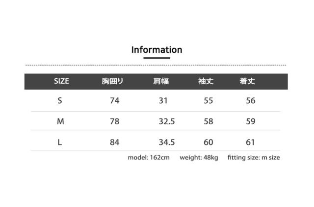M size: 胸囲り:78cm, 肩幅:32.5cm, 袖丈:58cm, 着丈:59cm