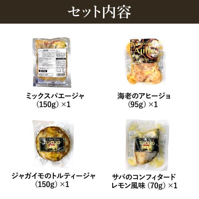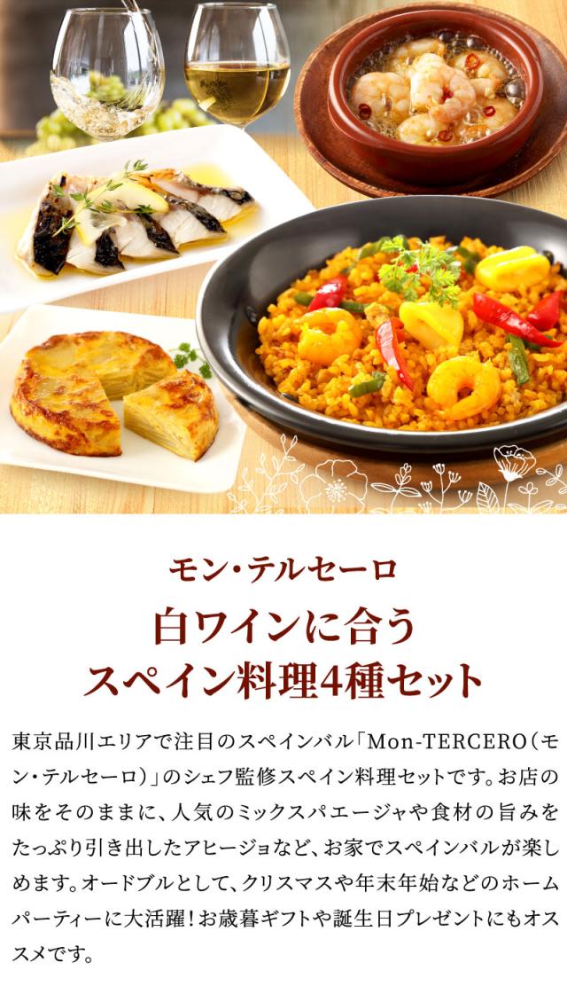 モン・テルセーロ 白ワインに合うスペイン料理4種セット グルメ ギフト 内祝い お祝い パエージャ パエリア アヒージョ コンフィタード トルティーヤ オードブル スペインバル おうちバル