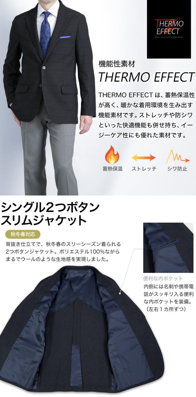 蓄熱保温素材「THERMO EFFECT」を使用したスリムジャケット。背抜き仕立てで秋冬春のスリーシーズン活躍するジャケットです。蓄熱保温性の高い機能性素材を使用している為、寒い季節でも暖かさを保ちます。ソフトで暖かみのあるウールライク素材が特徴で、家庭で洗えるウォッシャブルタイプなのでお手入れも簡単です。スラックスやベストと合わせてセットアップが可能で、ストレッチ性があり動きやすさも抜群。スリムなシルエットでおしゃれに決まります。