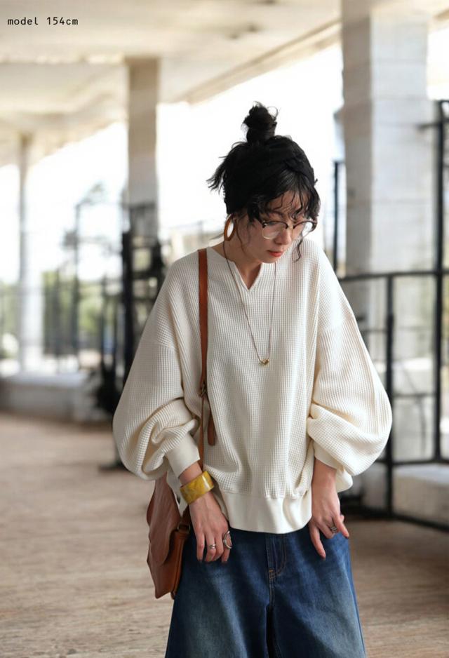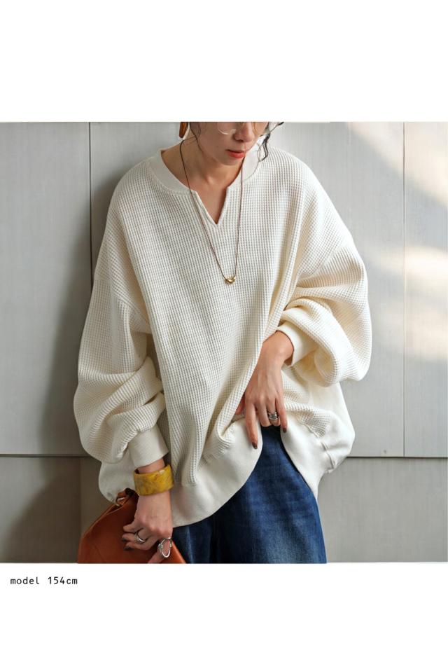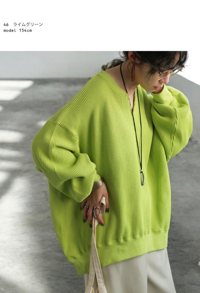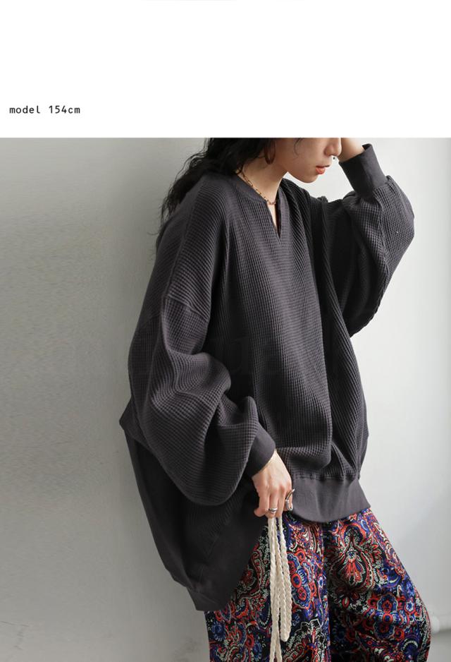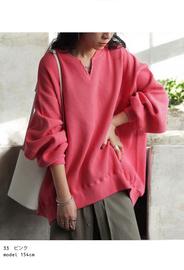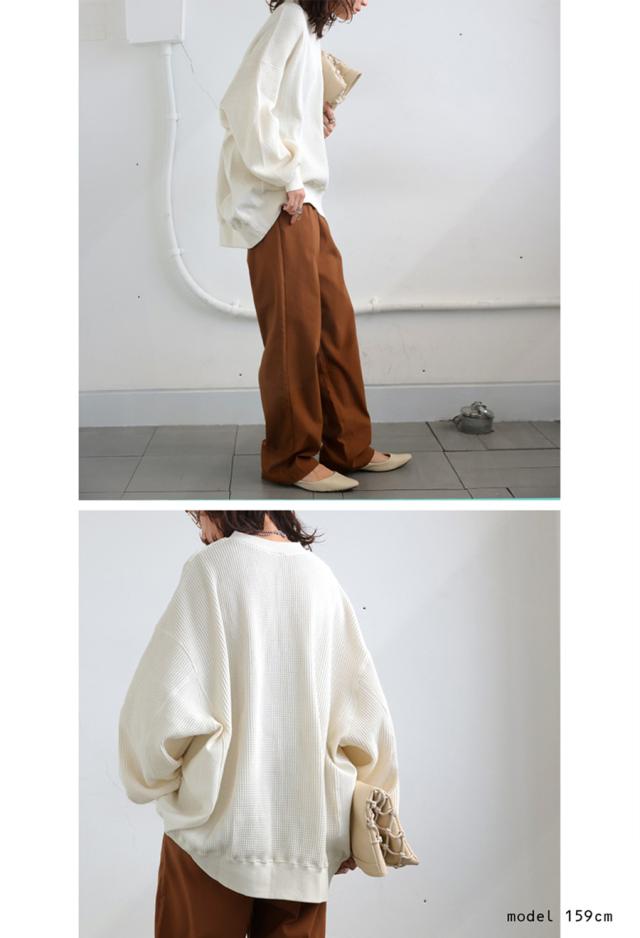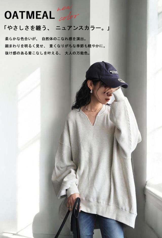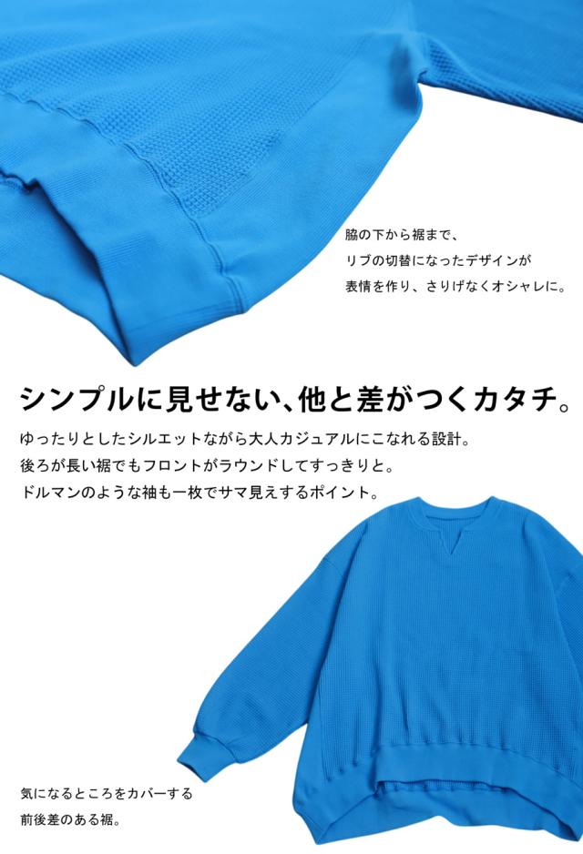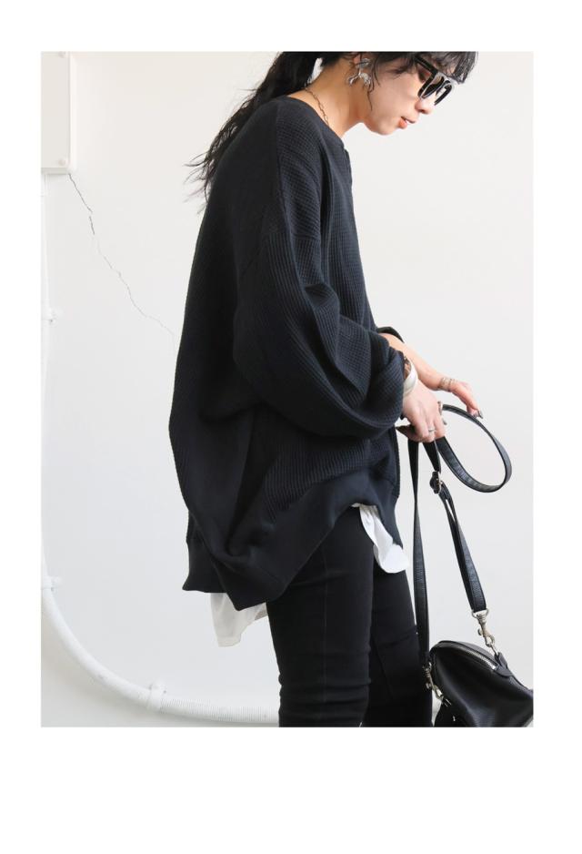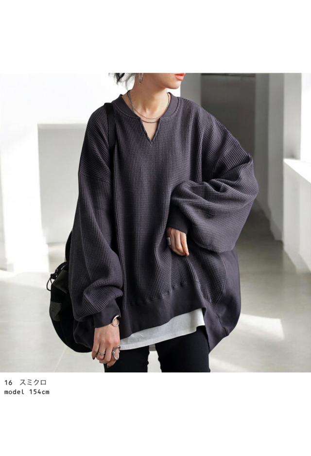 na-00482 プルオーバー トレーナー 長袖 無地 綿 コットン 鬼ワッフル シンプル クルーネック 切り替え ゆったり 前後差 ゆったり オーバーサイズ 着痩せ 体型カバー 大きめ 重ね着